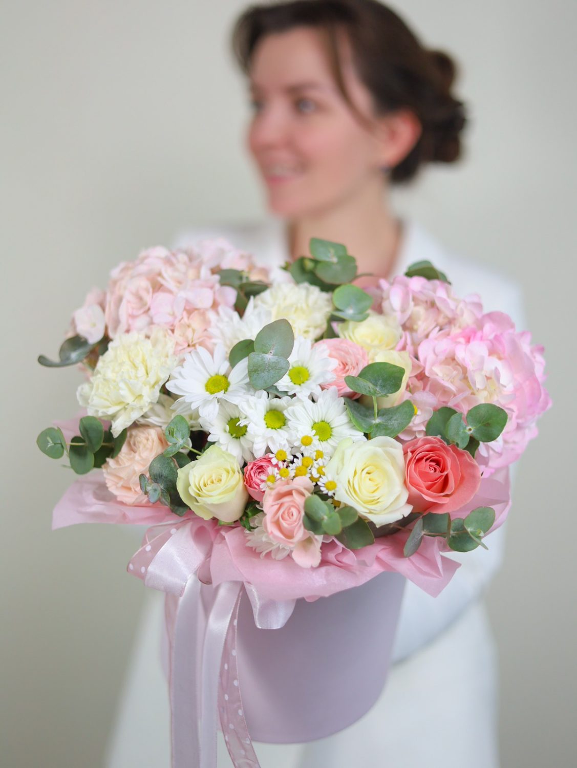 Состав: гортензии, стойкие диантусы и хризантема, кустовые и одноголовые розы, ромашки, эвкалипт.