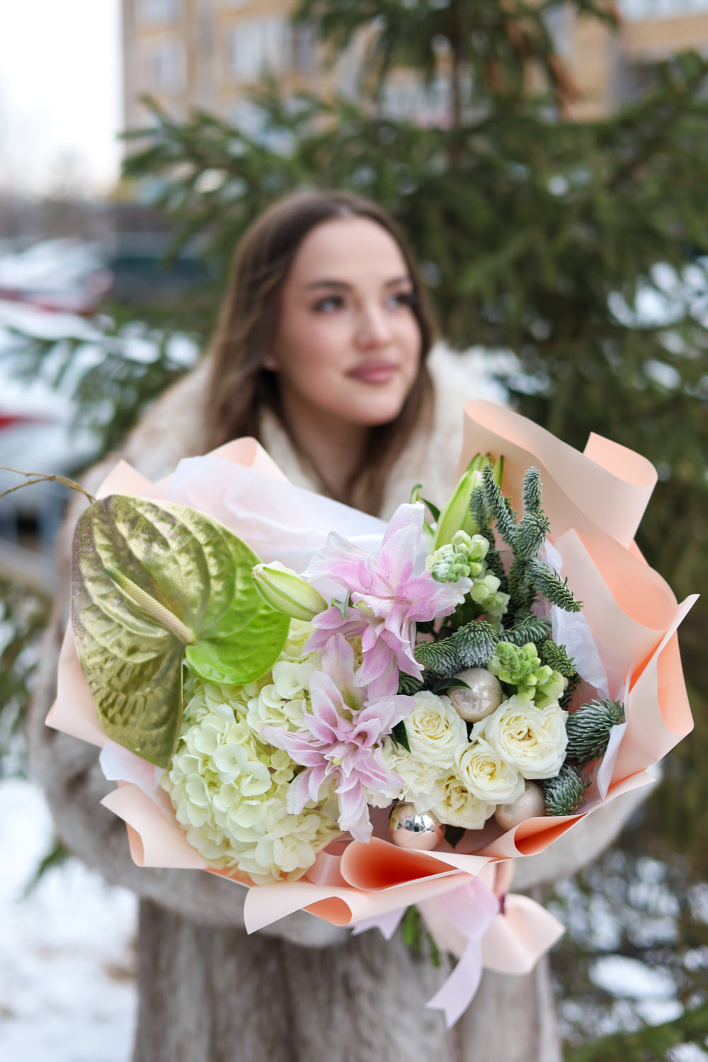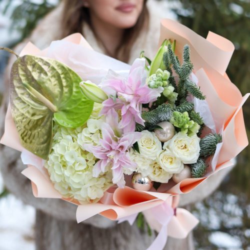 Прекрасный зимний букет с экзотическим антуриумом, пышной гортензией, пионовидными лилиями, кустовыми розами, антирринумом, елочными шарами и нобилисом.
