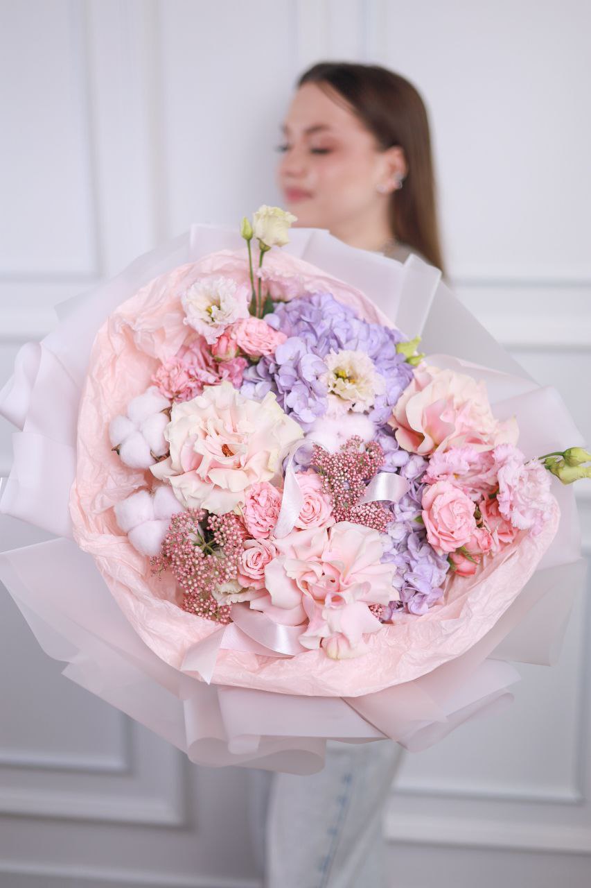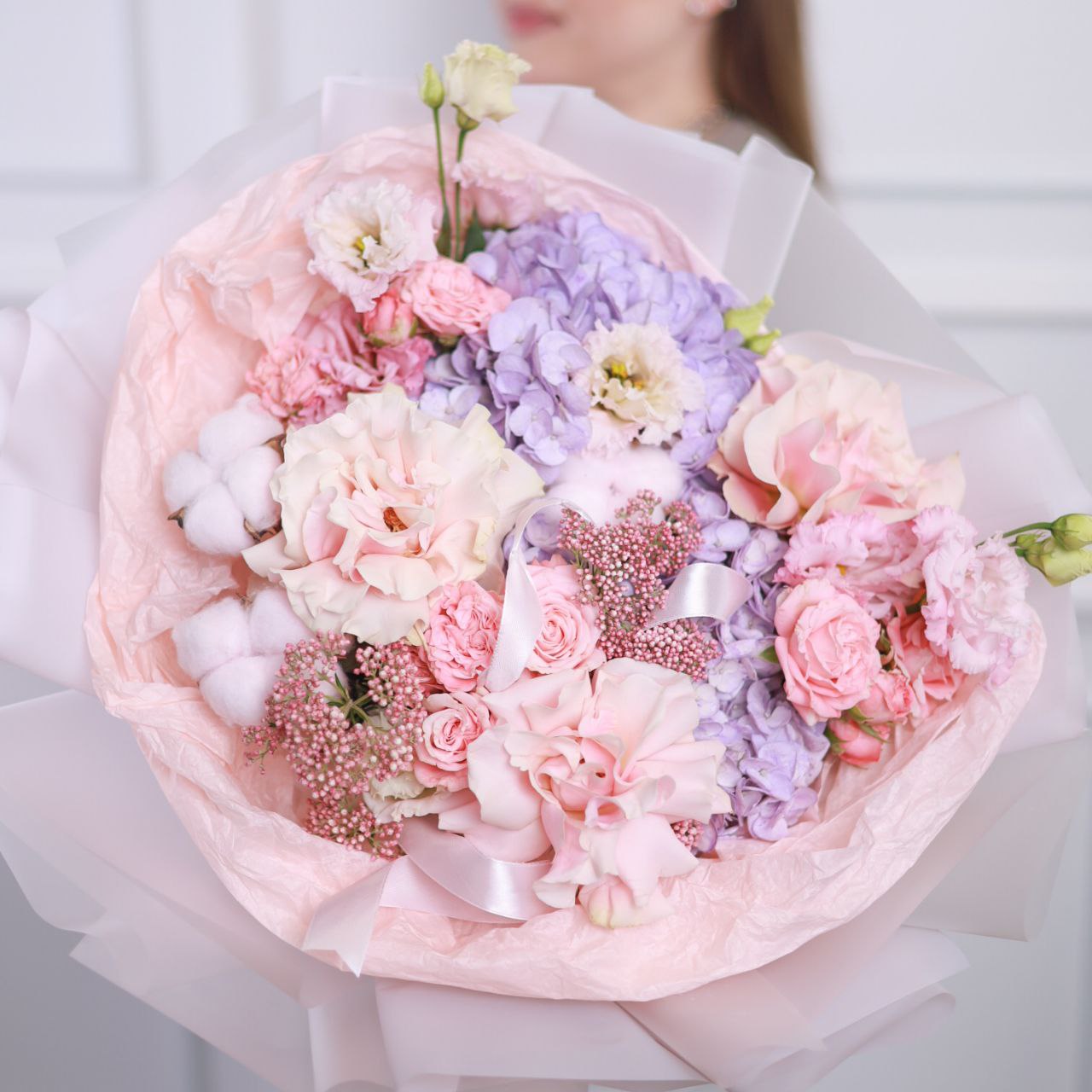 Букет с пышной гортензией, французской розой, ажурной эустомой, кустовой пионовидной розой, хлопком и озатамнусом в оформлении.