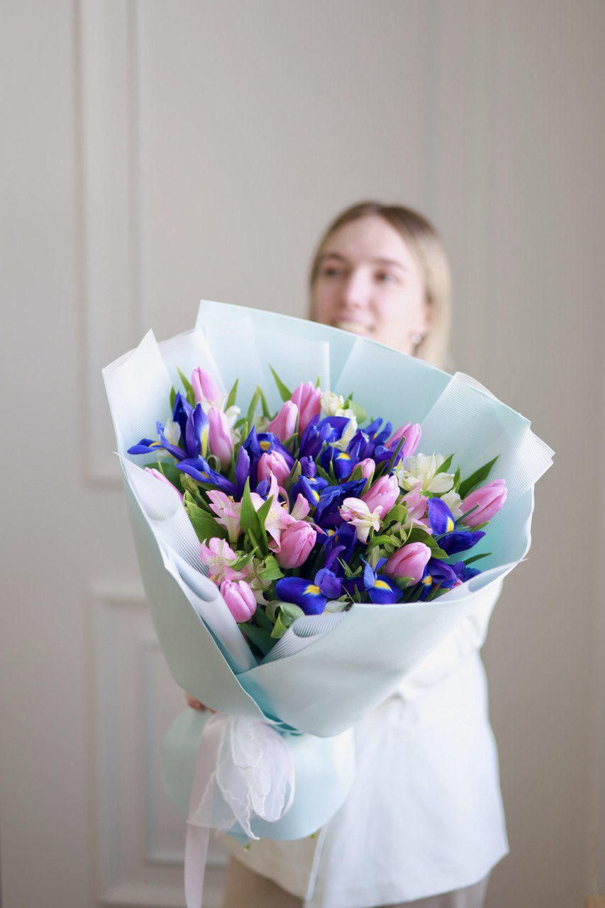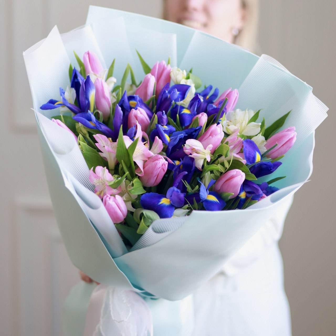 Состав: ирисы, тюльпаны, стойкая альстромерия.