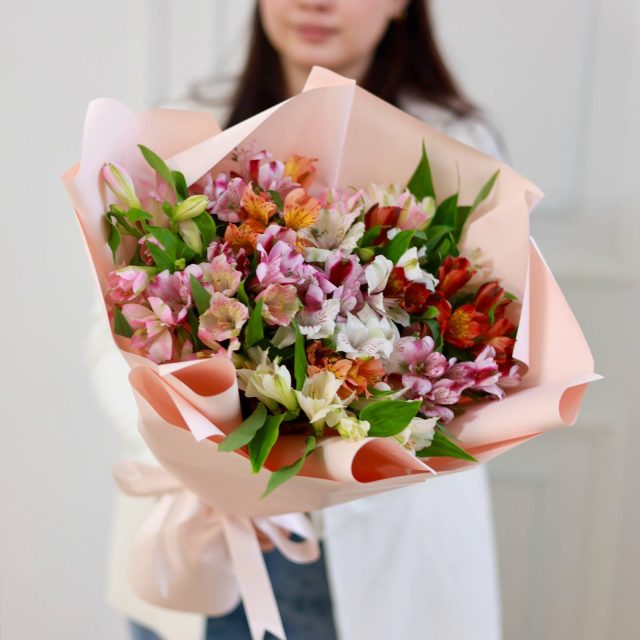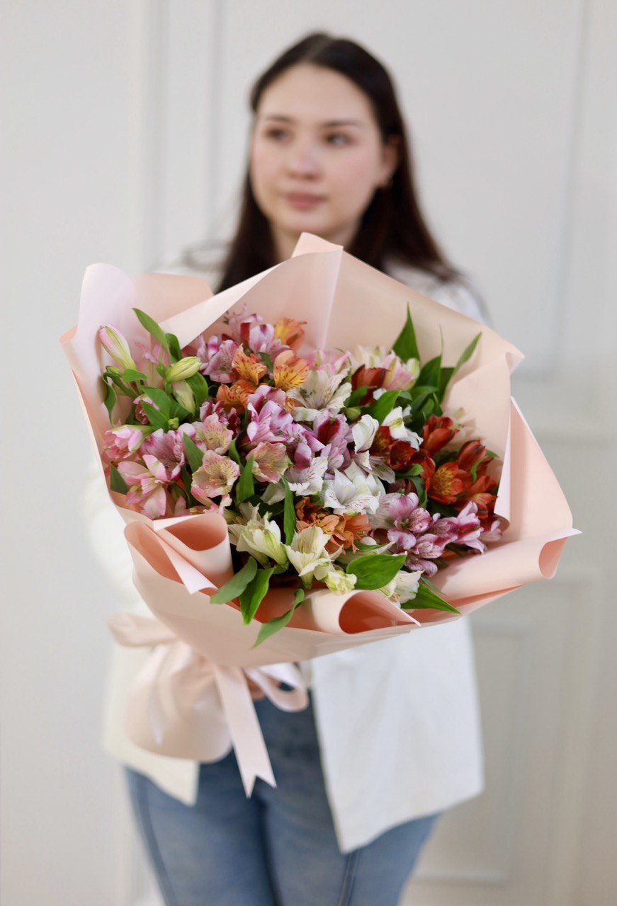 Прекрасный и очень стойкий букет из 19-ти веток высокой альстромерии микс.