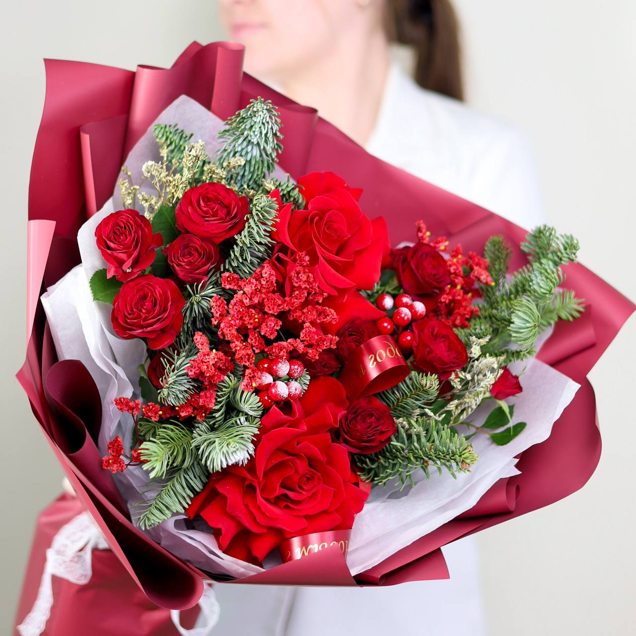 Букет французских роз, кустовых роз, нобилиса, лимониума и декоративных ягод в оформлении.