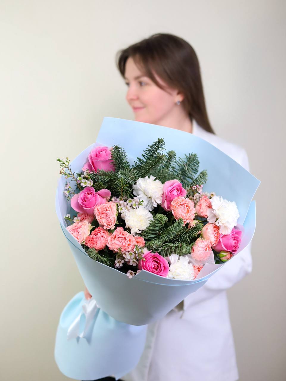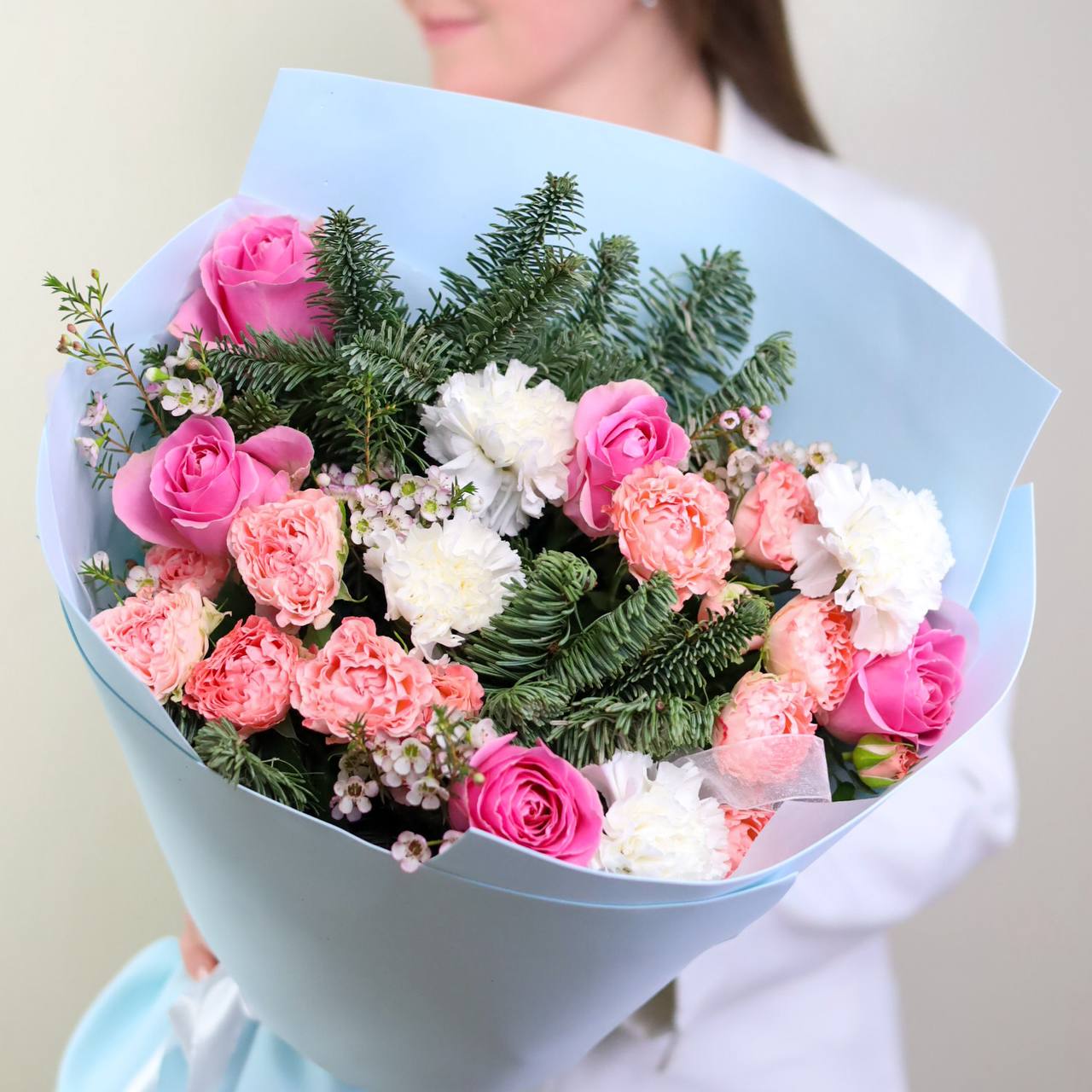 Букет кустовых роз, одноголовых роз, диантусов, хамелациума и нобилиса в оформлении.