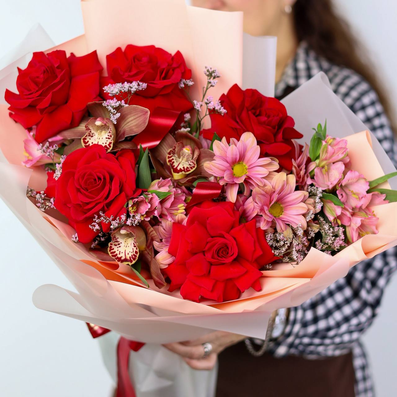 Букет французских роз, орхидей, хризантемы и стойкой альстромерии в оформлении.,