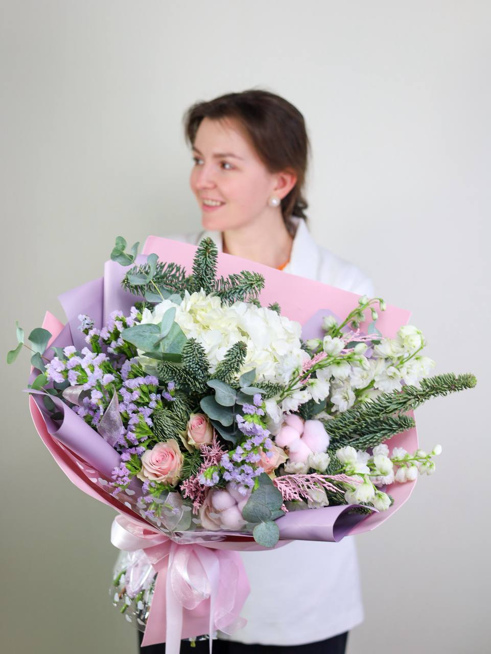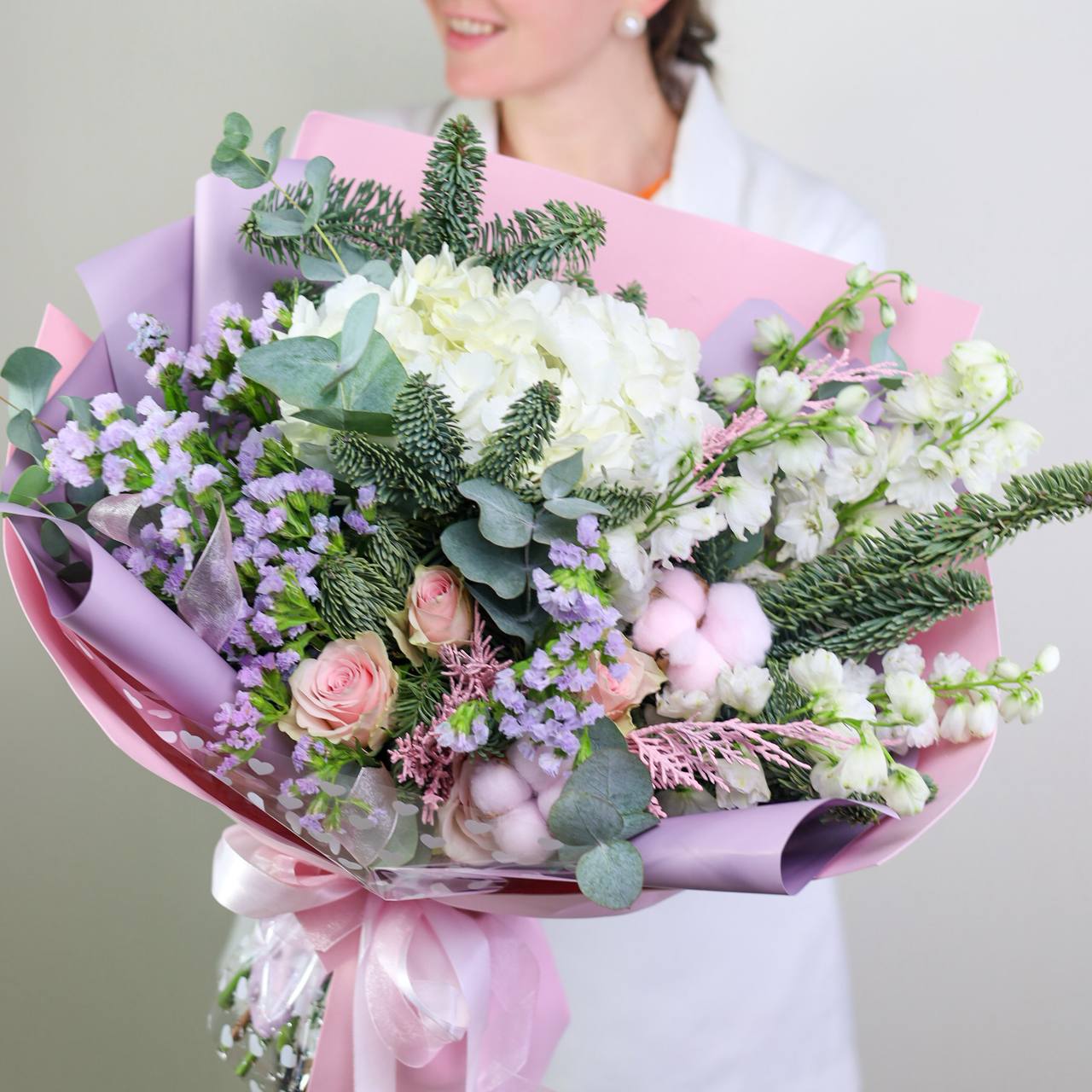 Букет пышной гортензии, статицы, ароматной маттиолы, роз, нобилиса, хлопка, душистого эвкалипта и сухоцветов в оформлении.
