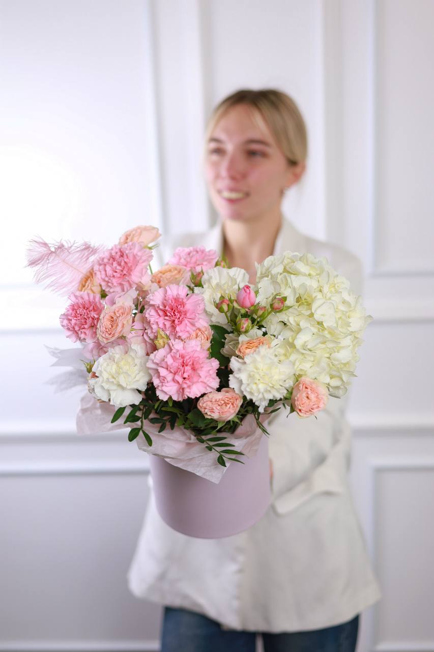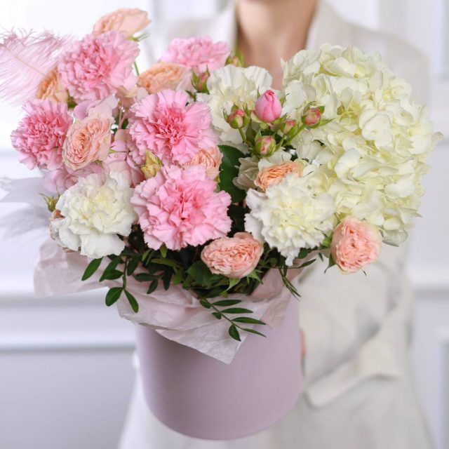 Композиция пышной гортензии, стойких диантусов, кустовых роз, зелени и перьев в шляпной коробке.