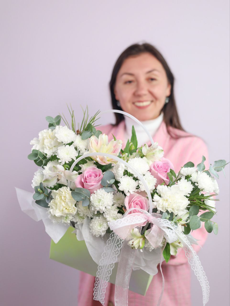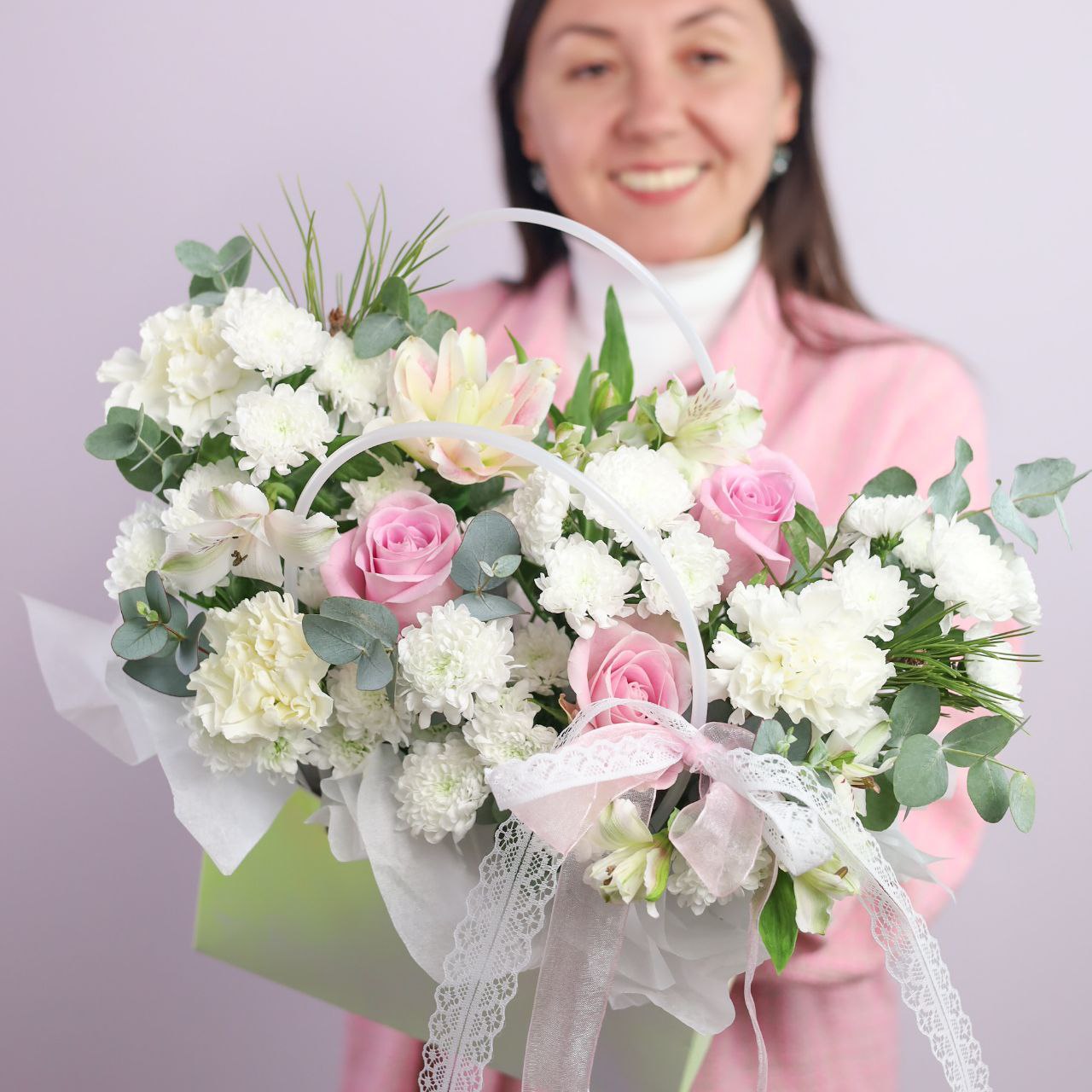 Композиция с пышной хризантемой, пионовидной лилией, стойким диантусом, альстромерией, розой и эвкалиптом в сумочке.