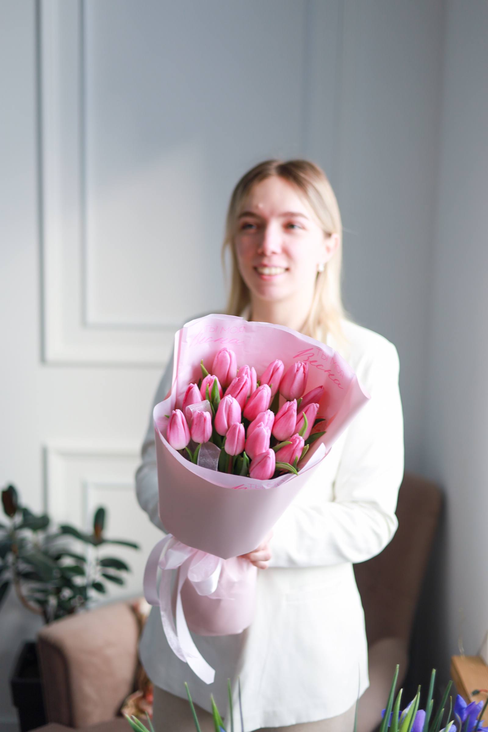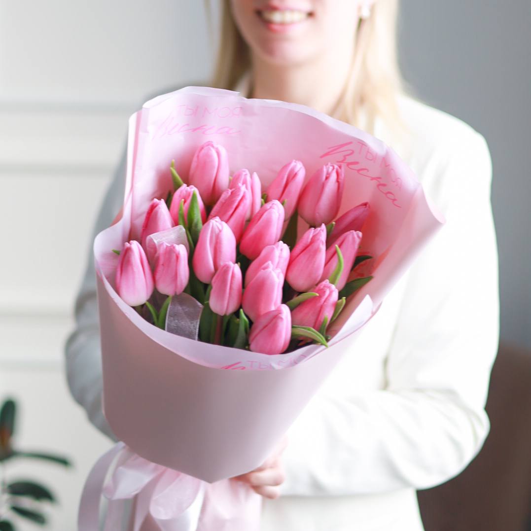 Красивый нежный букет из 19-ти розовых тюльпанов в оформлении.