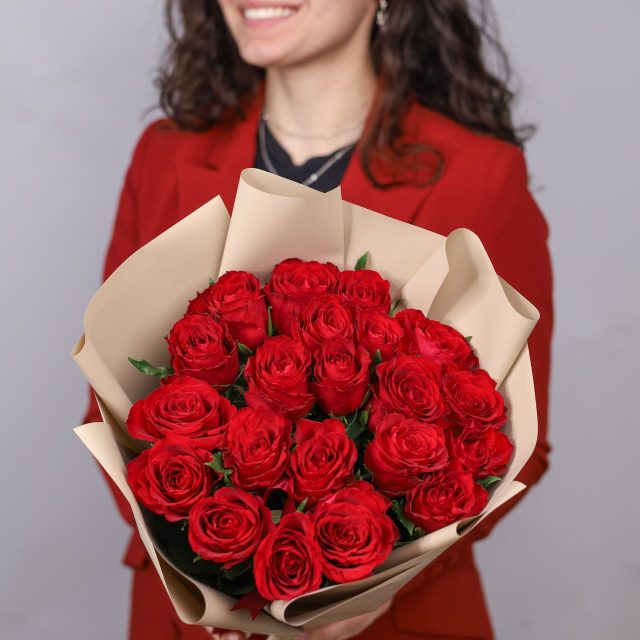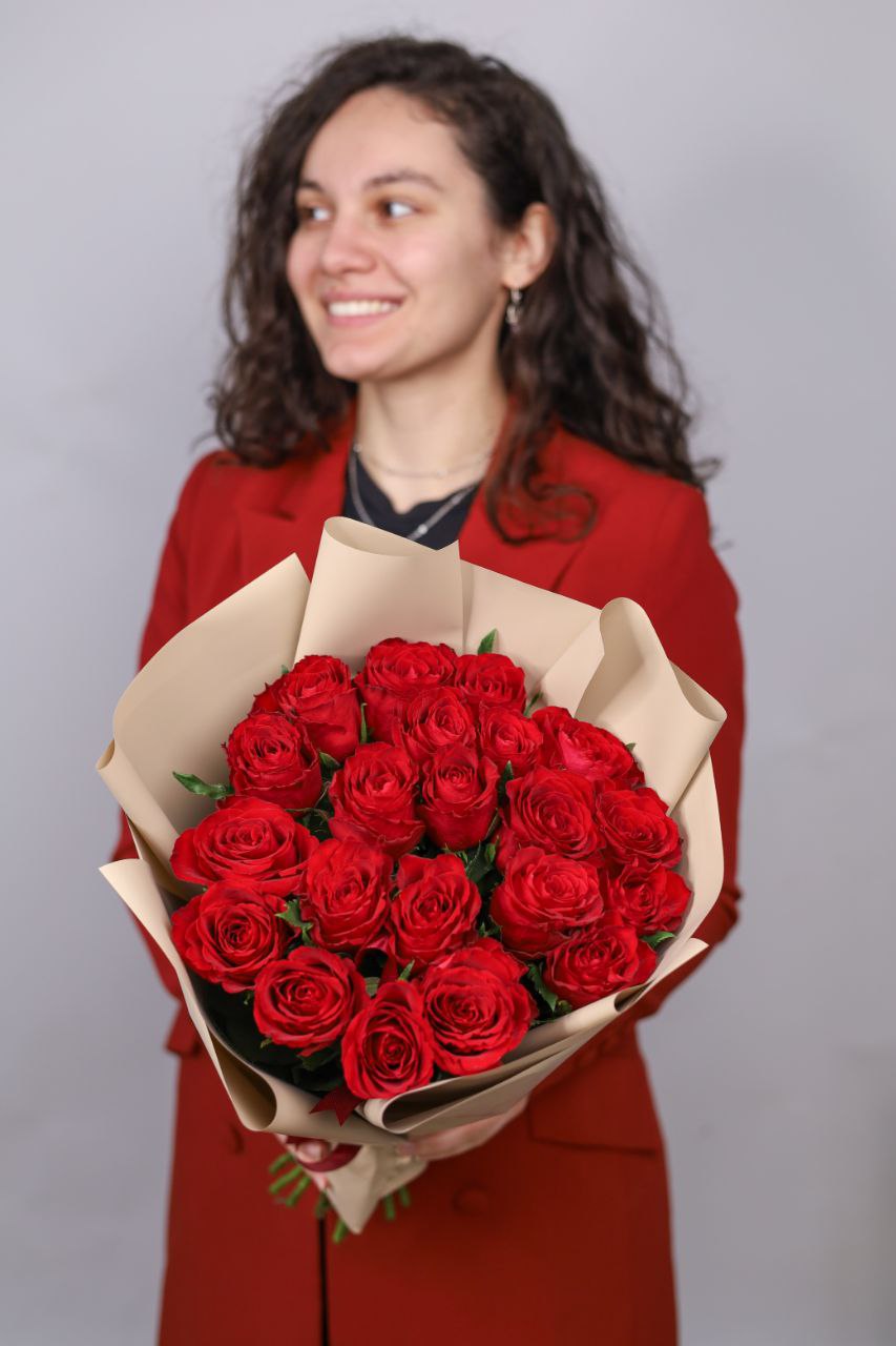 Букет из 21-ой красной розы в оформлении. Высота букета около 45 см.