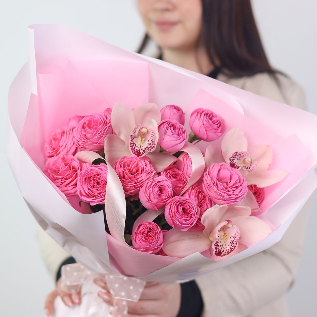 Нежный букет кустовых пионовидных роз и орхидей в оформлении.