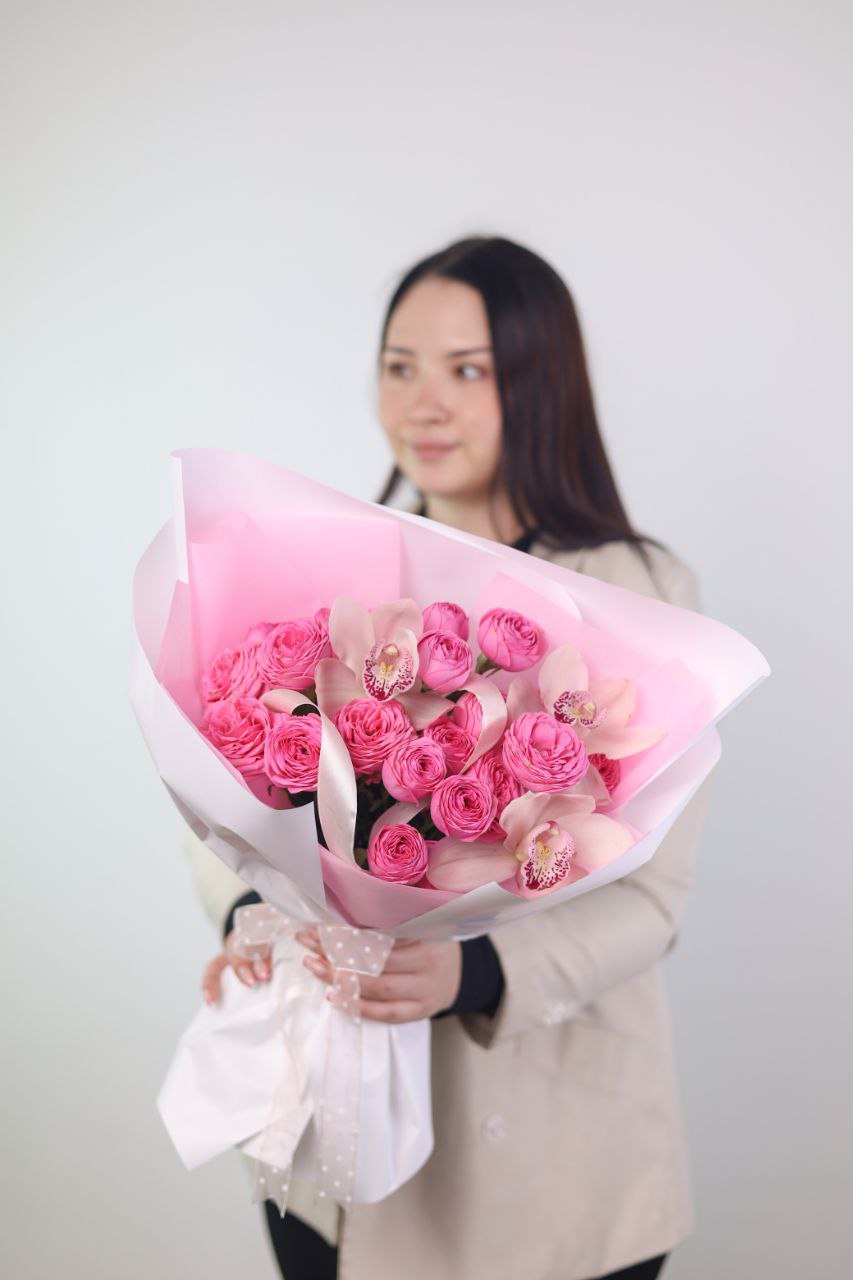 Очаровательный букет пионовидных роз и орхидей