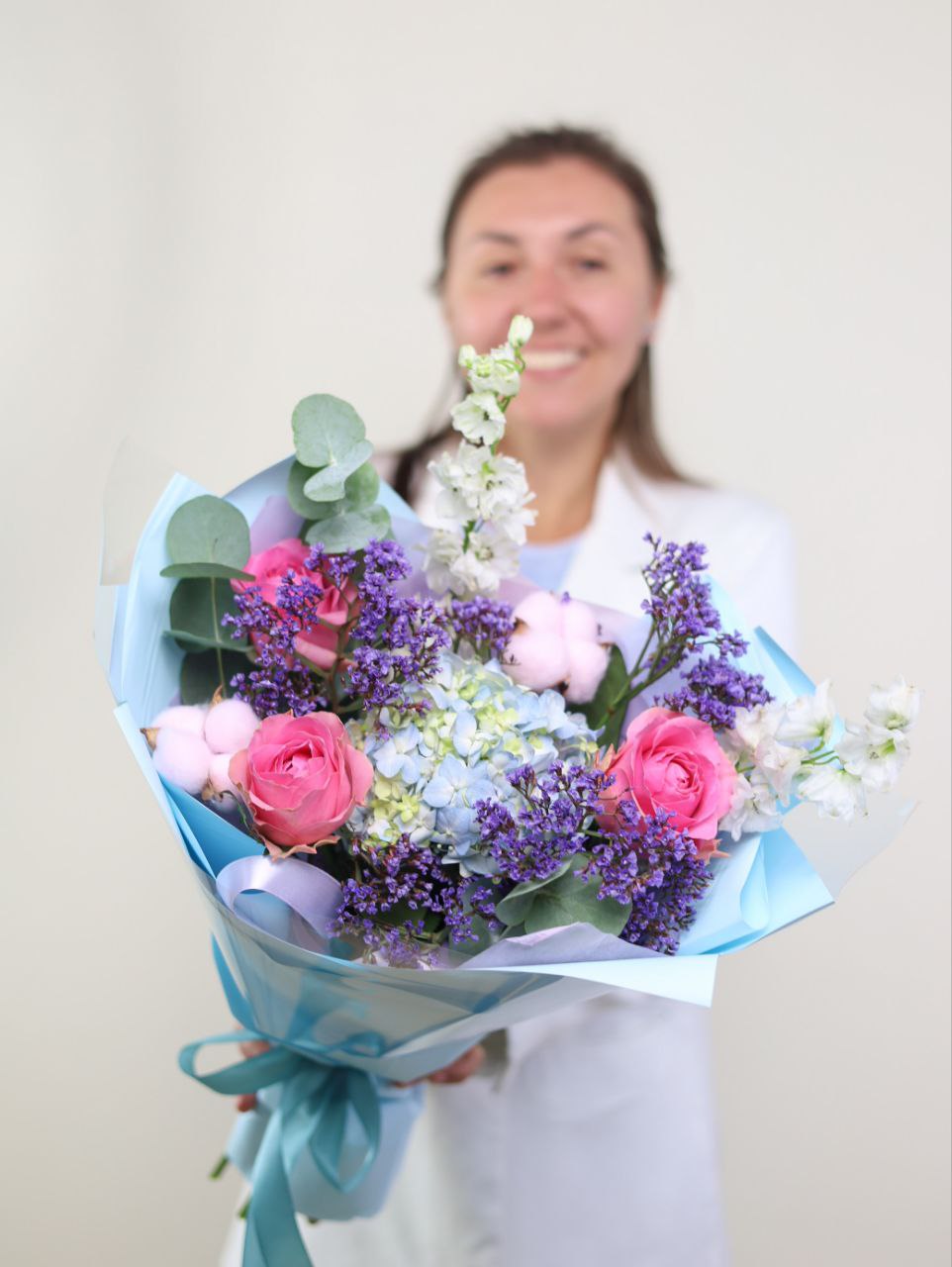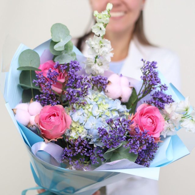 Букет в оформлении с пышной гортензией, дельфиниум, лимониум, роза, хлопок и эвкалипт.