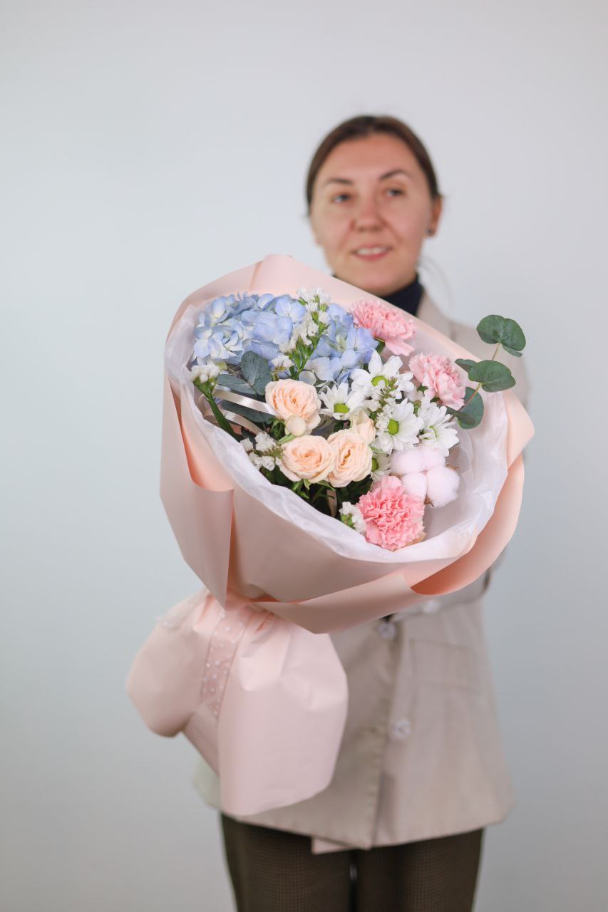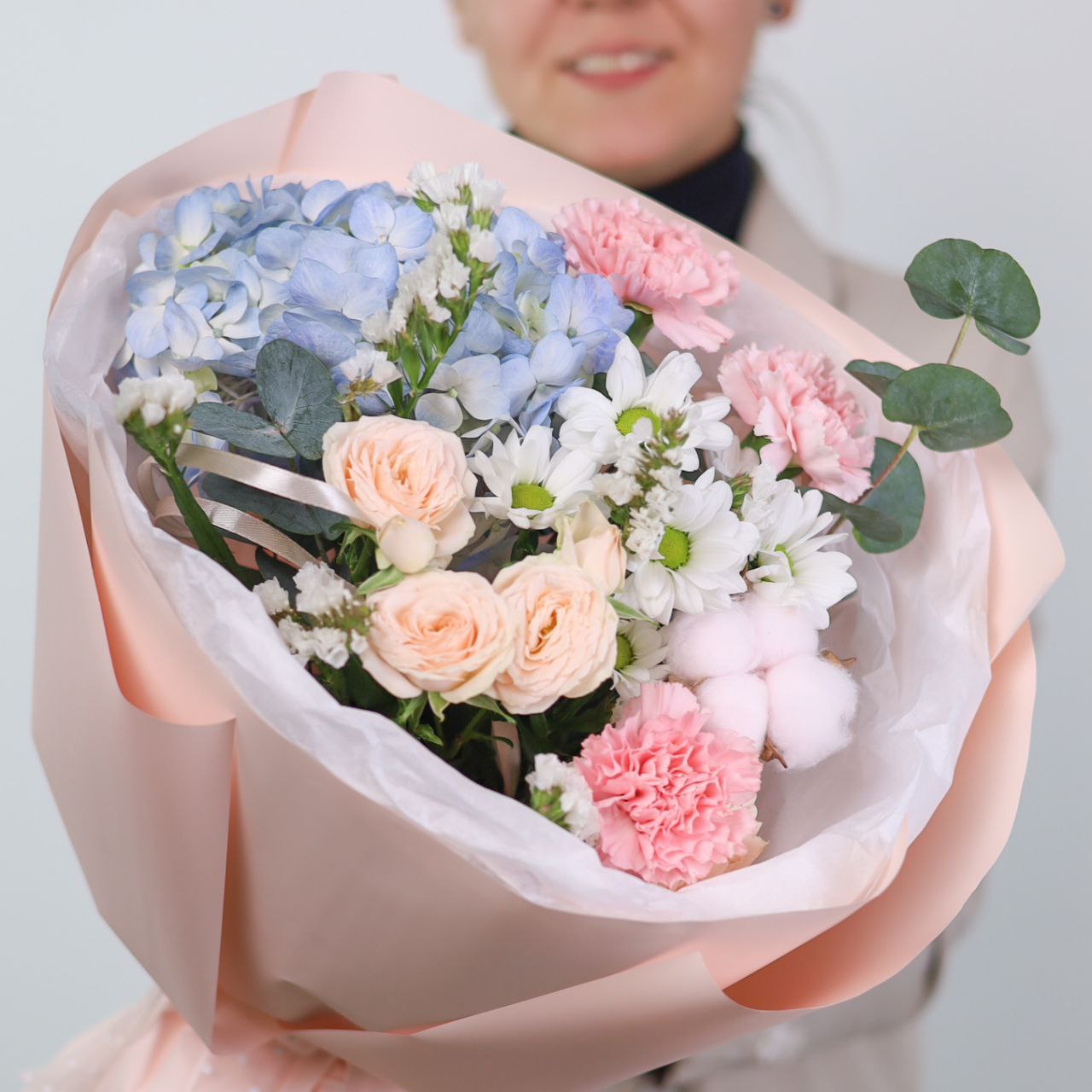 Букет с пышной гортензией, кустовой пионовидной розой, стойким диантусом, статицей, хризантемой и эвкалиптом в оформлении.