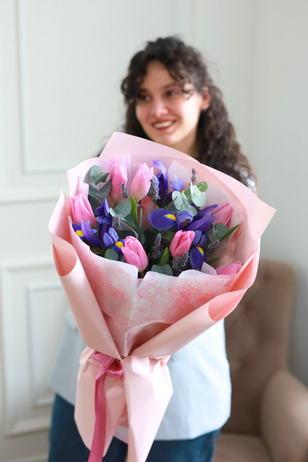 Количество товара Очаровательный букет с ирисами и тюльпанами