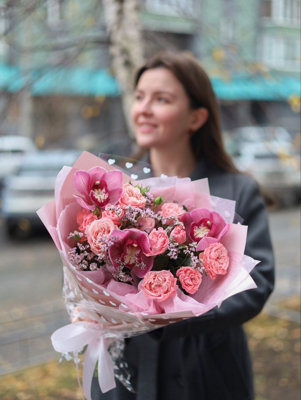 Букет стойкой орхидеи, пионовидной кустовой розы и лимониумом в оформлении.
