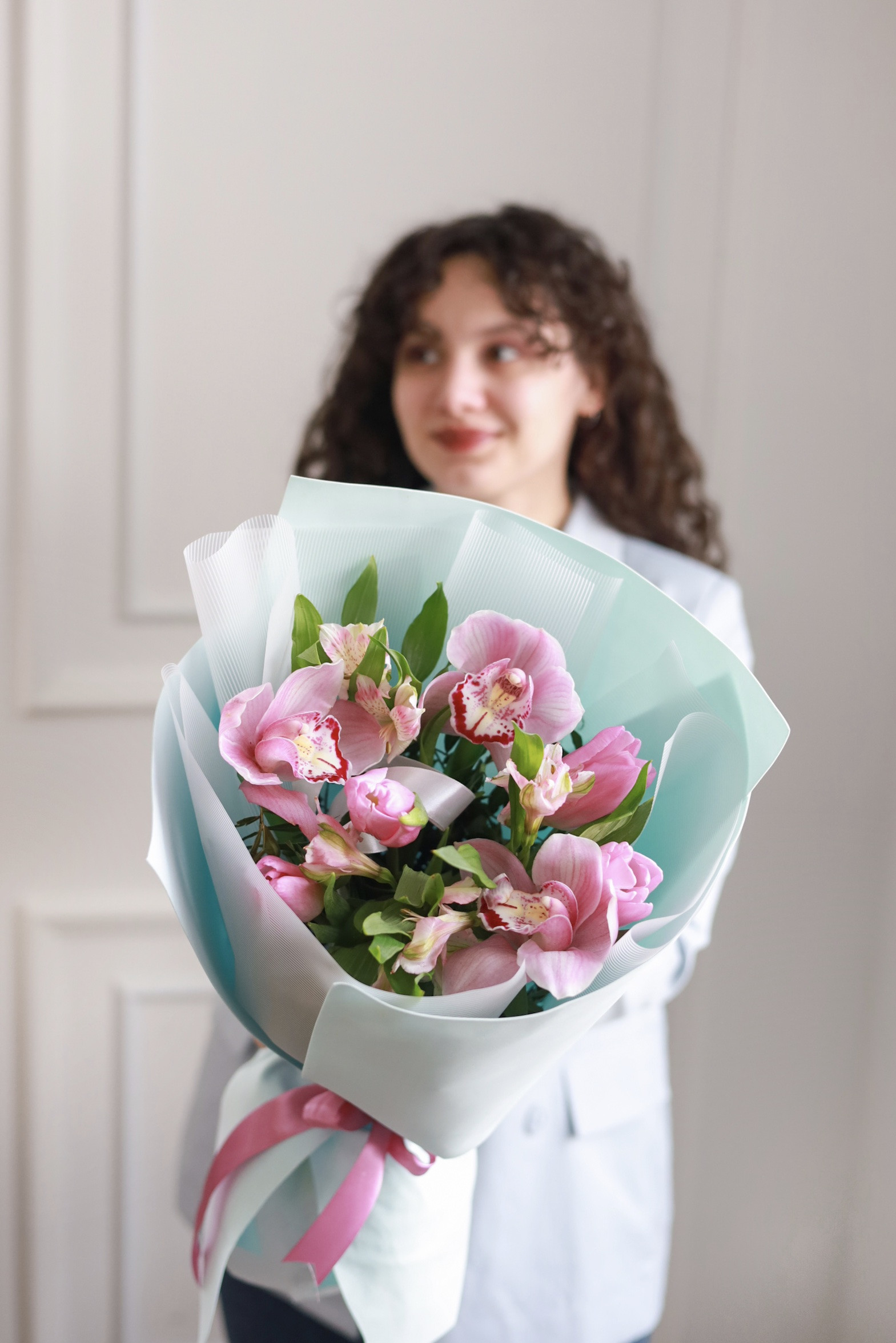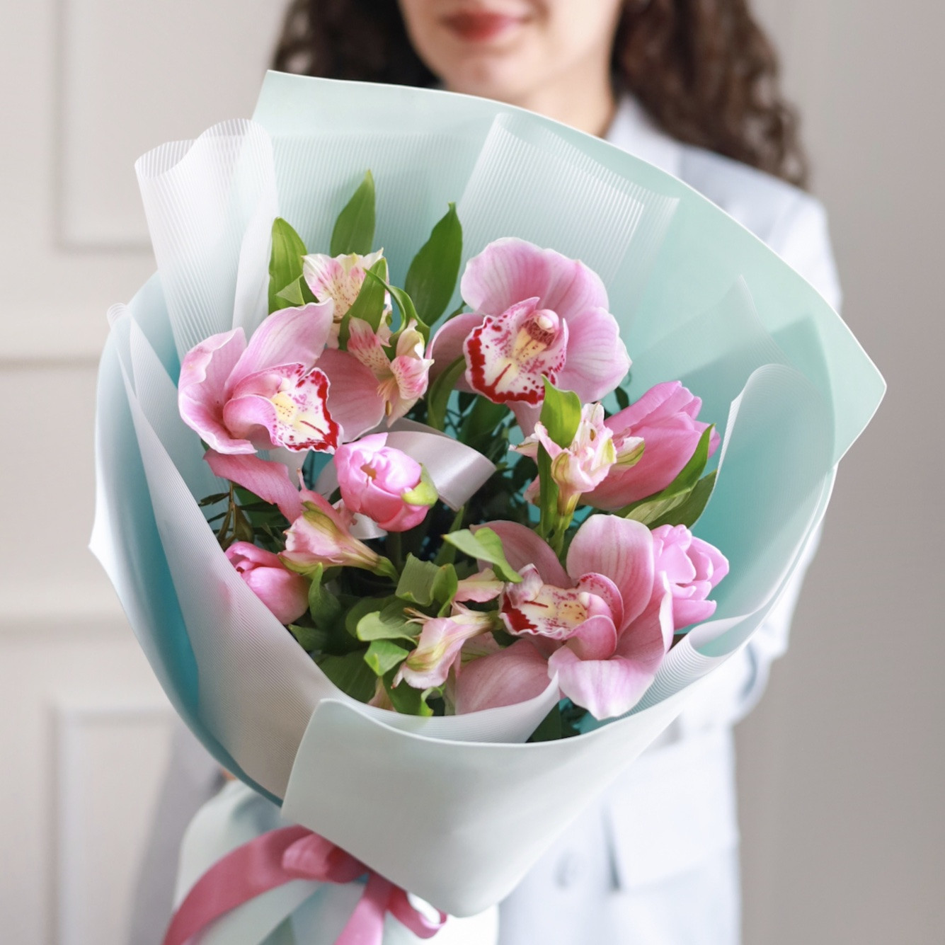 Состав: тюльпаны, стойкие орхидеи, альстромерия.