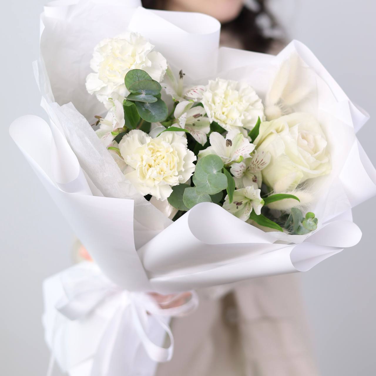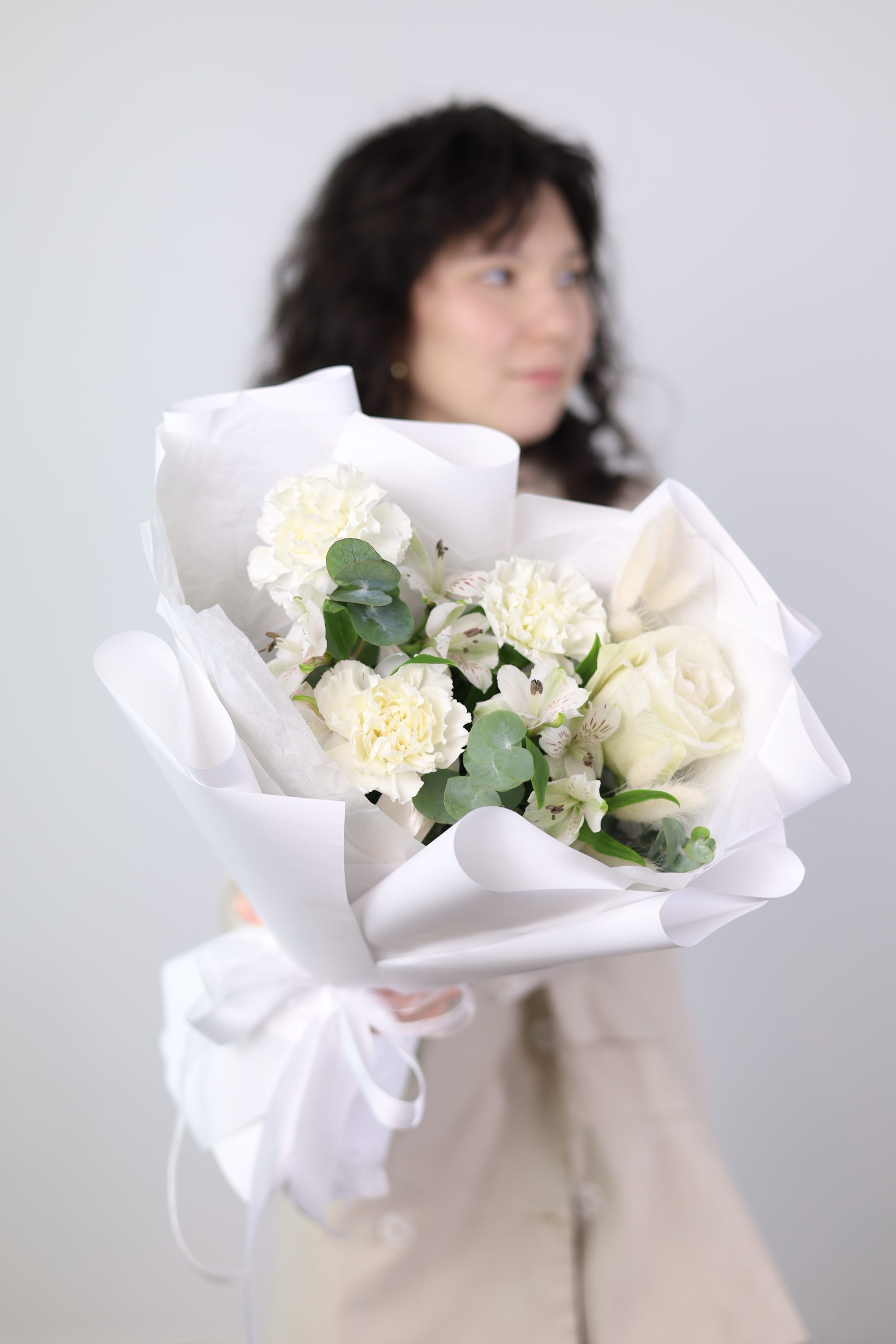 Букет с альстромерией, пионовидной розой, стойким диантусом и эвкалиптом в оформлении.