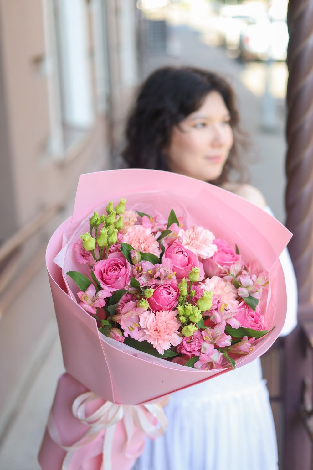 Прекрасный сборный букет в розовой гамме в стильном оформлении.