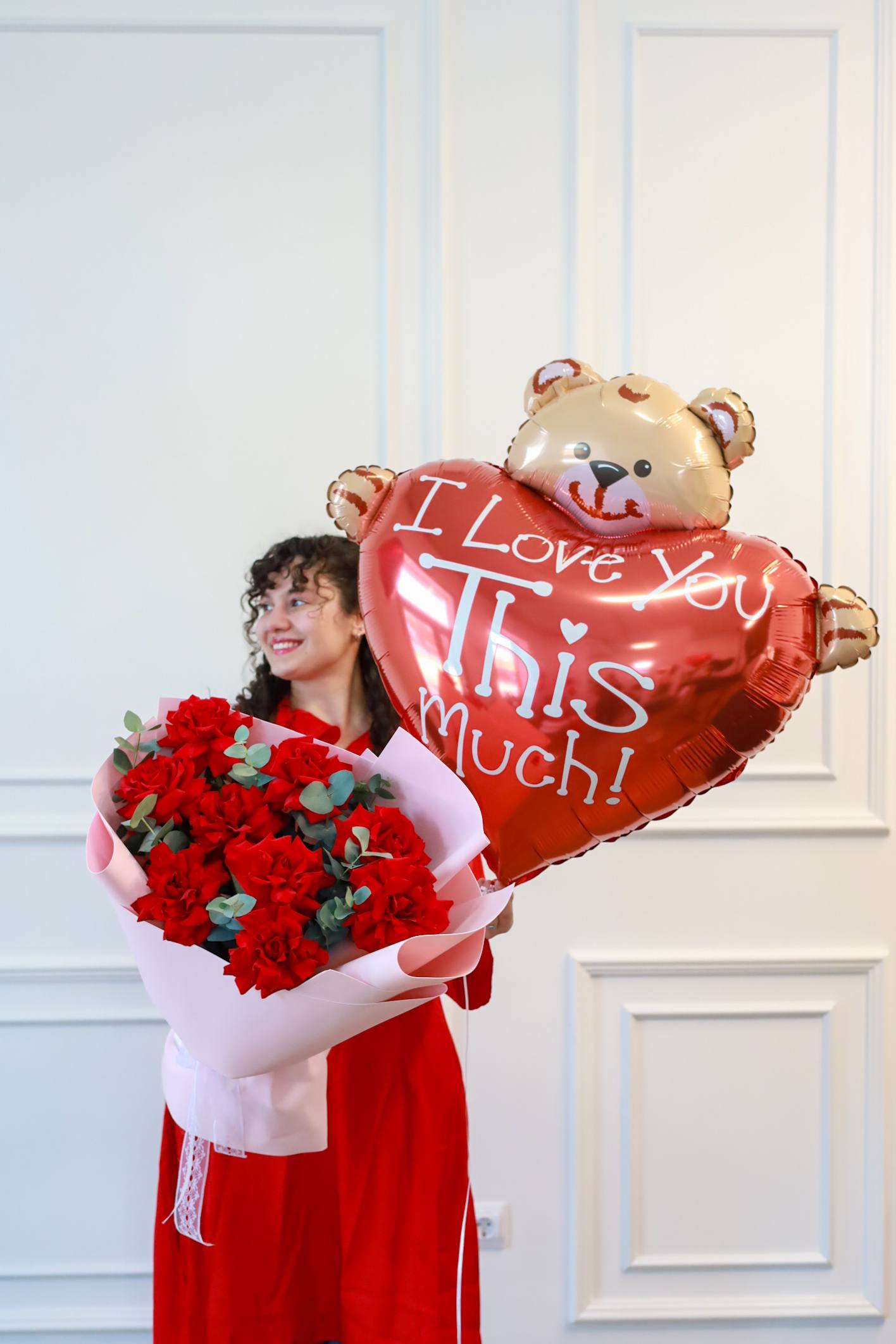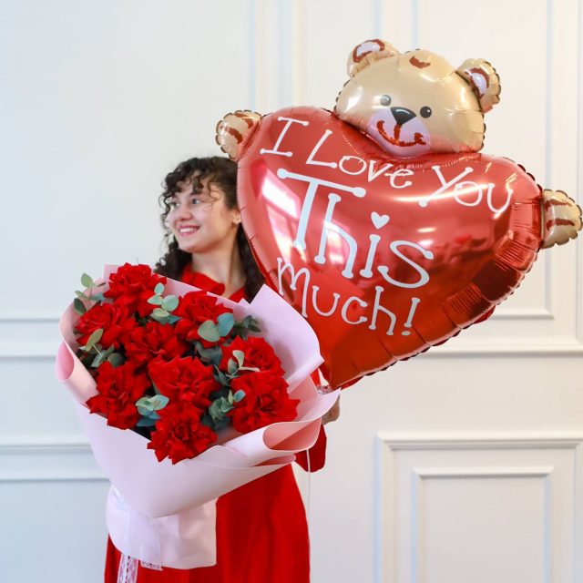 Великолепный праздничный сет из букета красных французских роз с эвкалиптом и большим шаром.