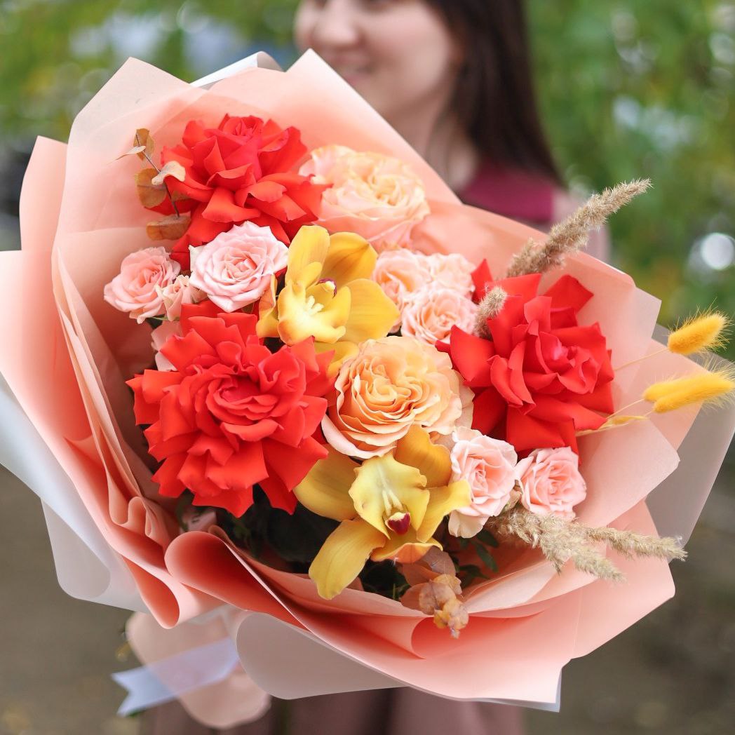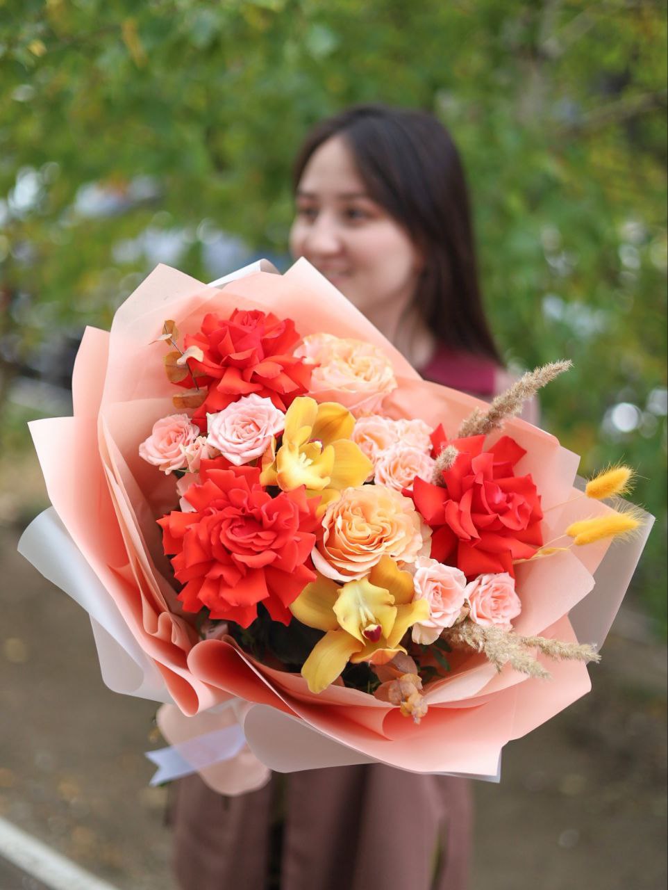 Букет с французской розой, орхидеей, пионовидной крупной и кустовой розой в оформлении.