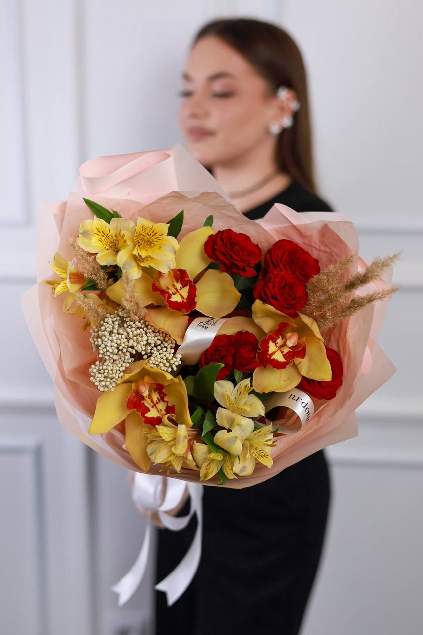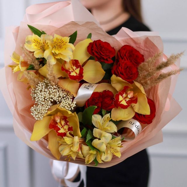 Букет стойких орхидей, кустовых роз, стойкой альстромерии, озотамнуса и сухоцветов в оформлении.
