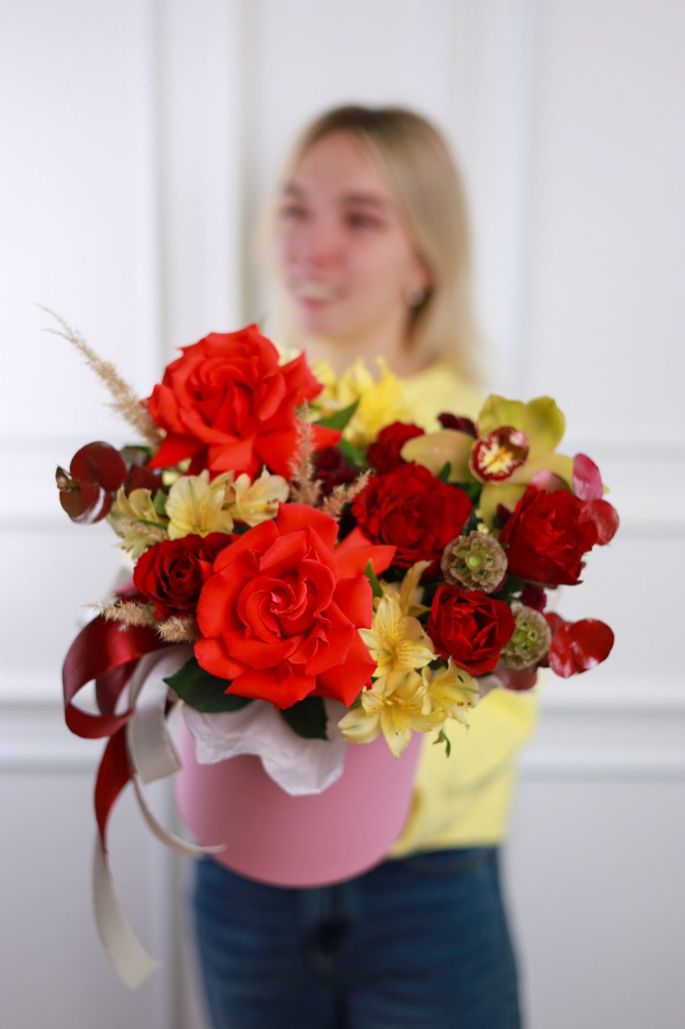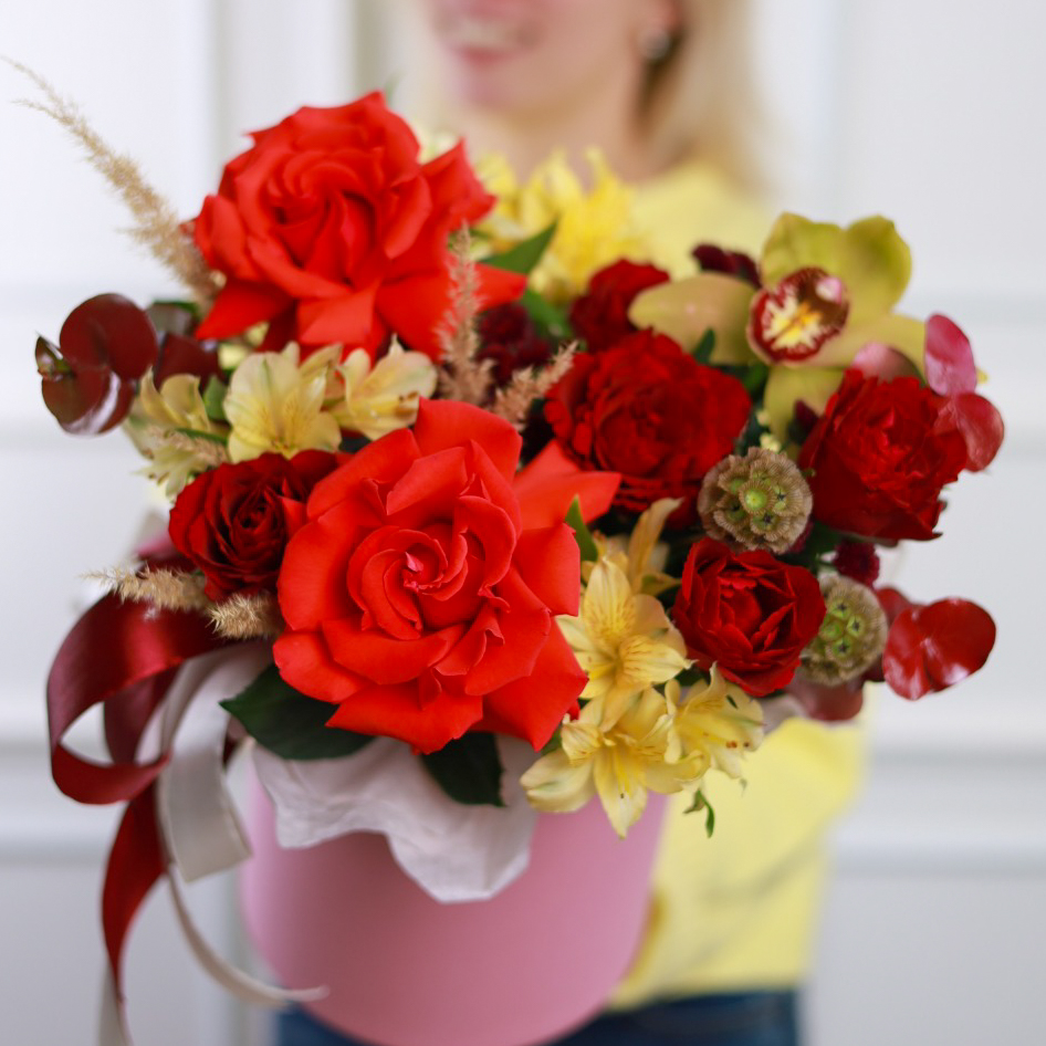 Композиция с розами, орхидеями, альстромерией, сухоцветами, скабиозой и крашеным эвкалиптом.