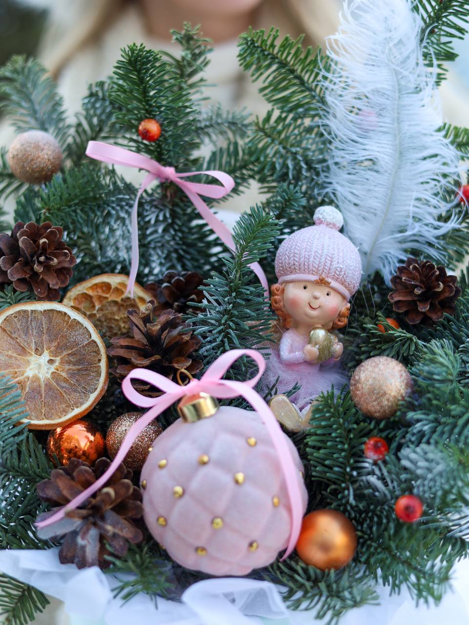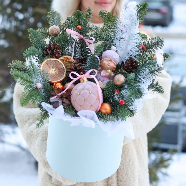 Композиция нобилиса, декоративных игрушек, апельсина, шишек и перьев в шляпной коробке.