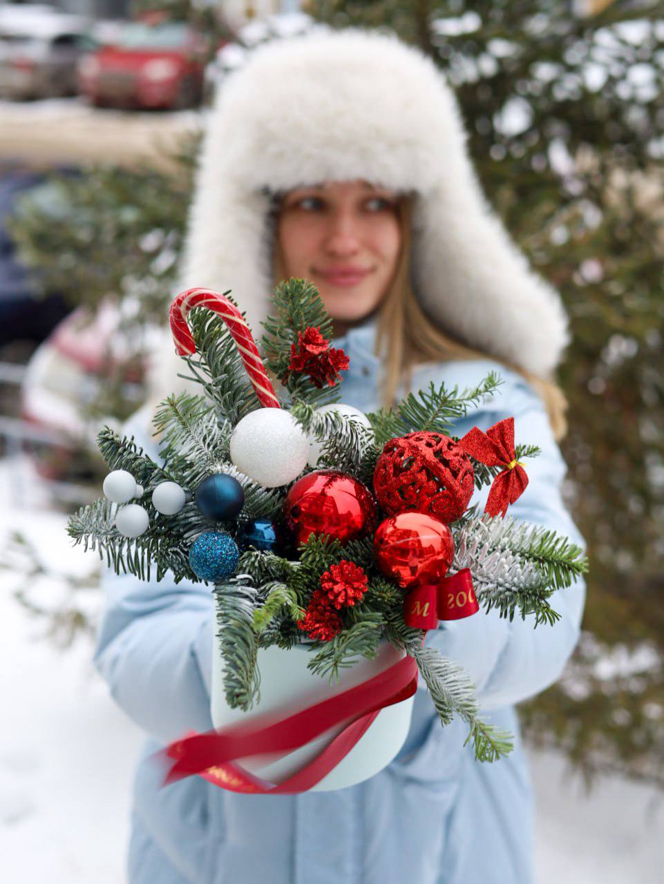 Красивая новогодняя композиция в зимней гамме в шляпной коробке.