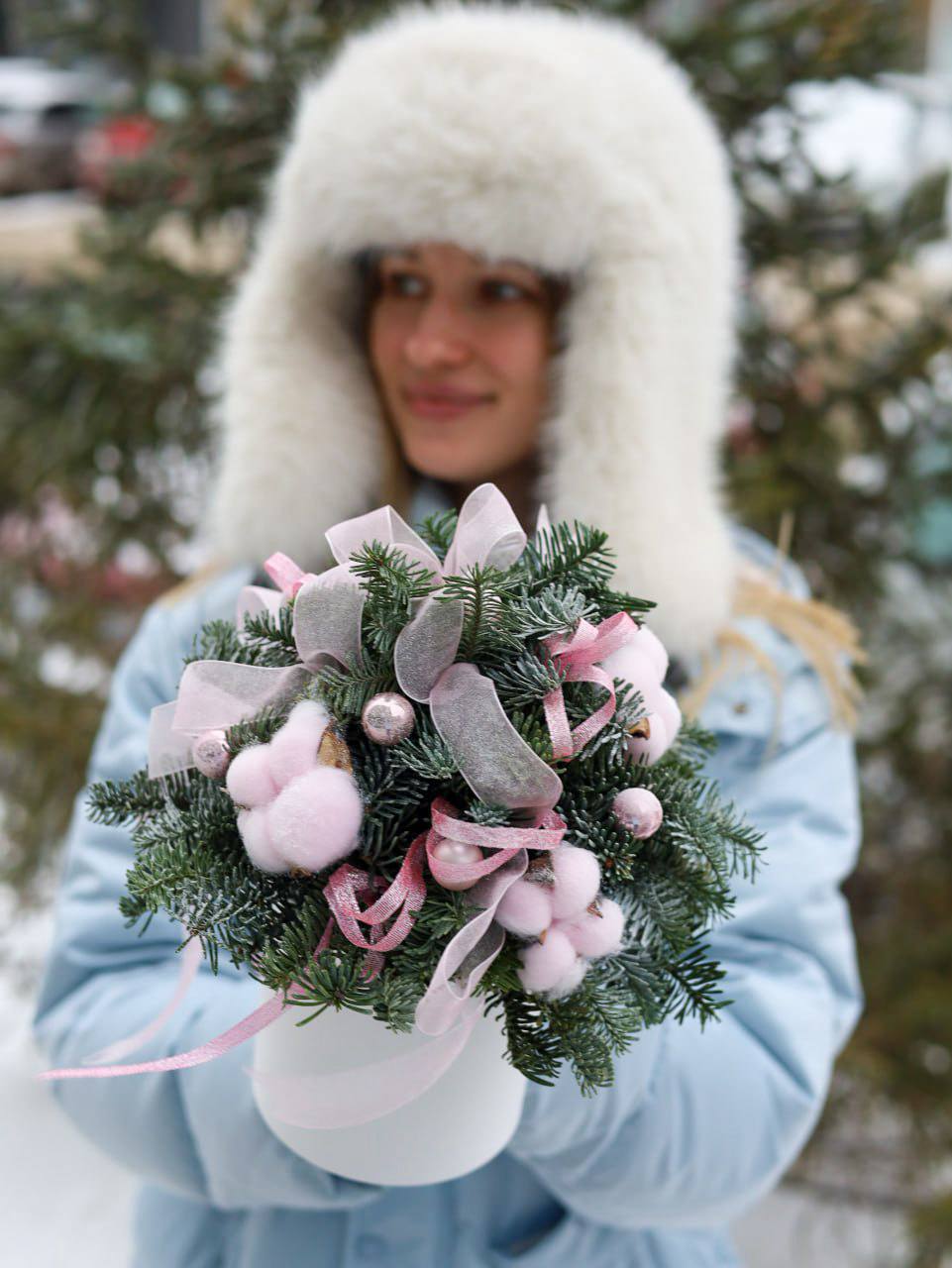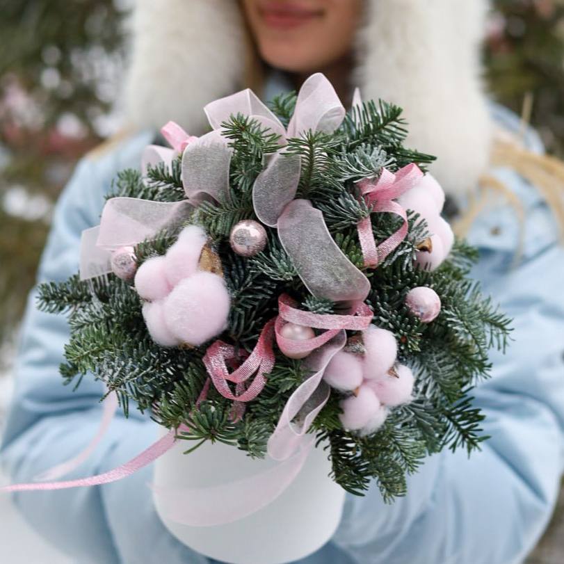 Композиция нобилиса , хлопка и декоративных игрушек в шляпной коробке.