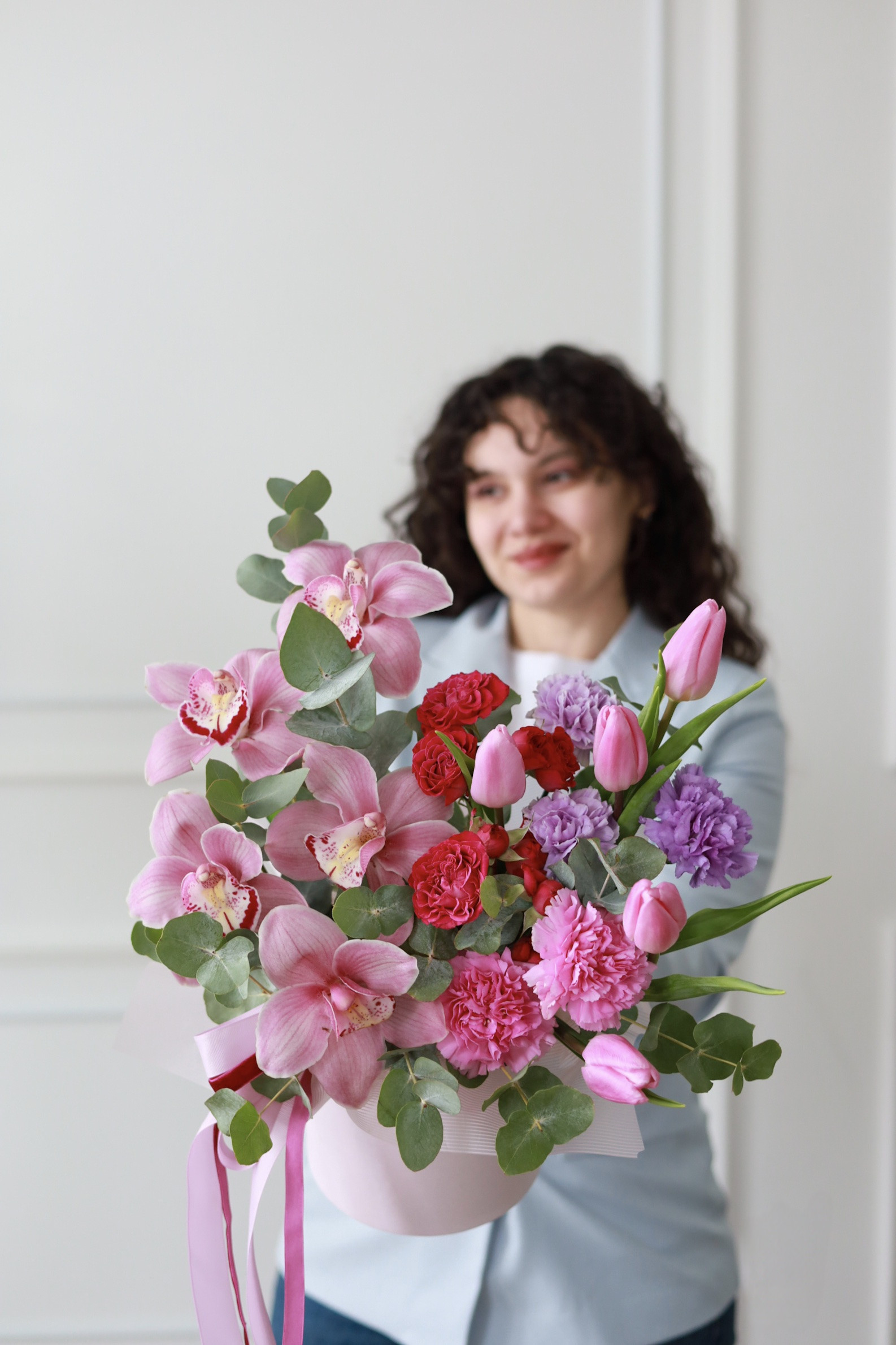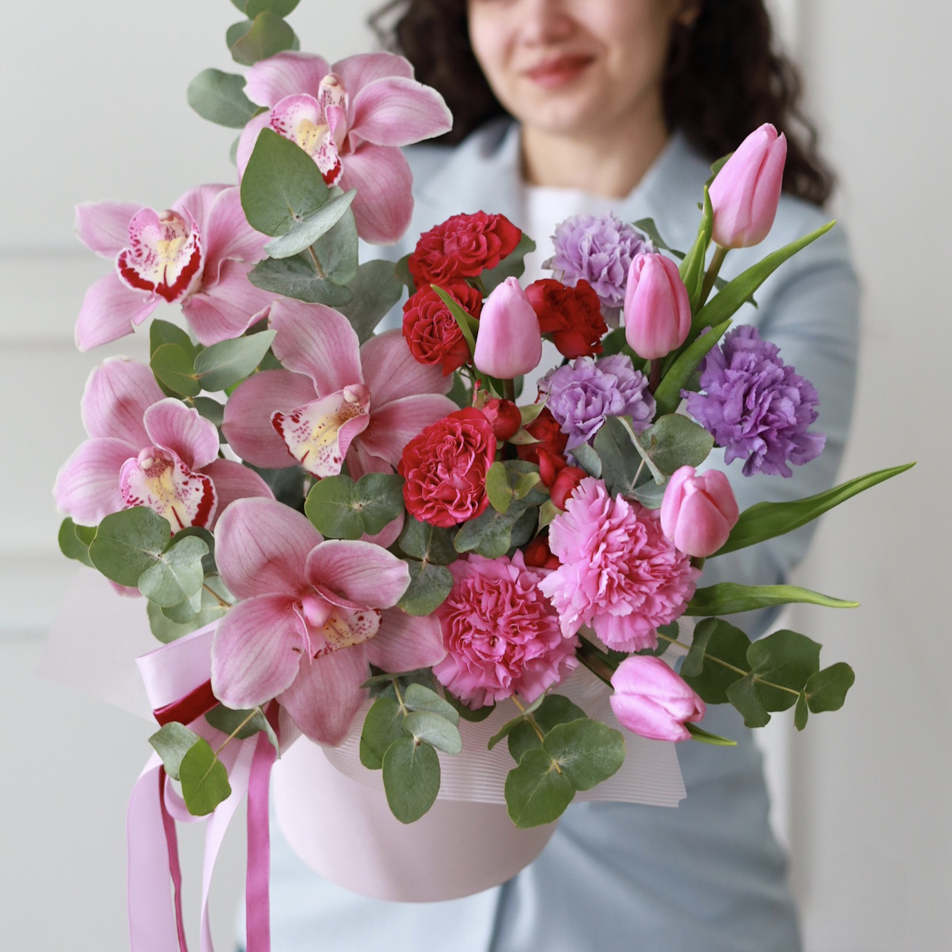 Состав: стойкие орхидеи и диантусы, тюльпаны, кустовые пионовидные розы, эвкалипт.