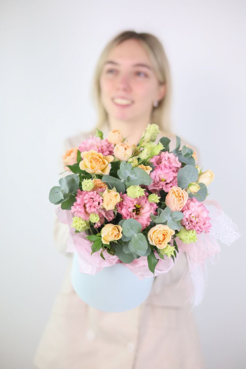Композиция с ажурной эустомой и кустовой пионовидной розой в шляпной коробке.