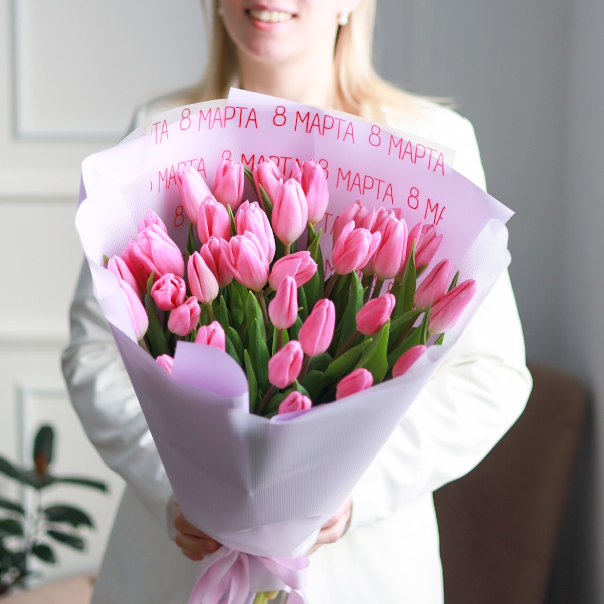 Прекрасный букет из 35 розовых тюльпанов