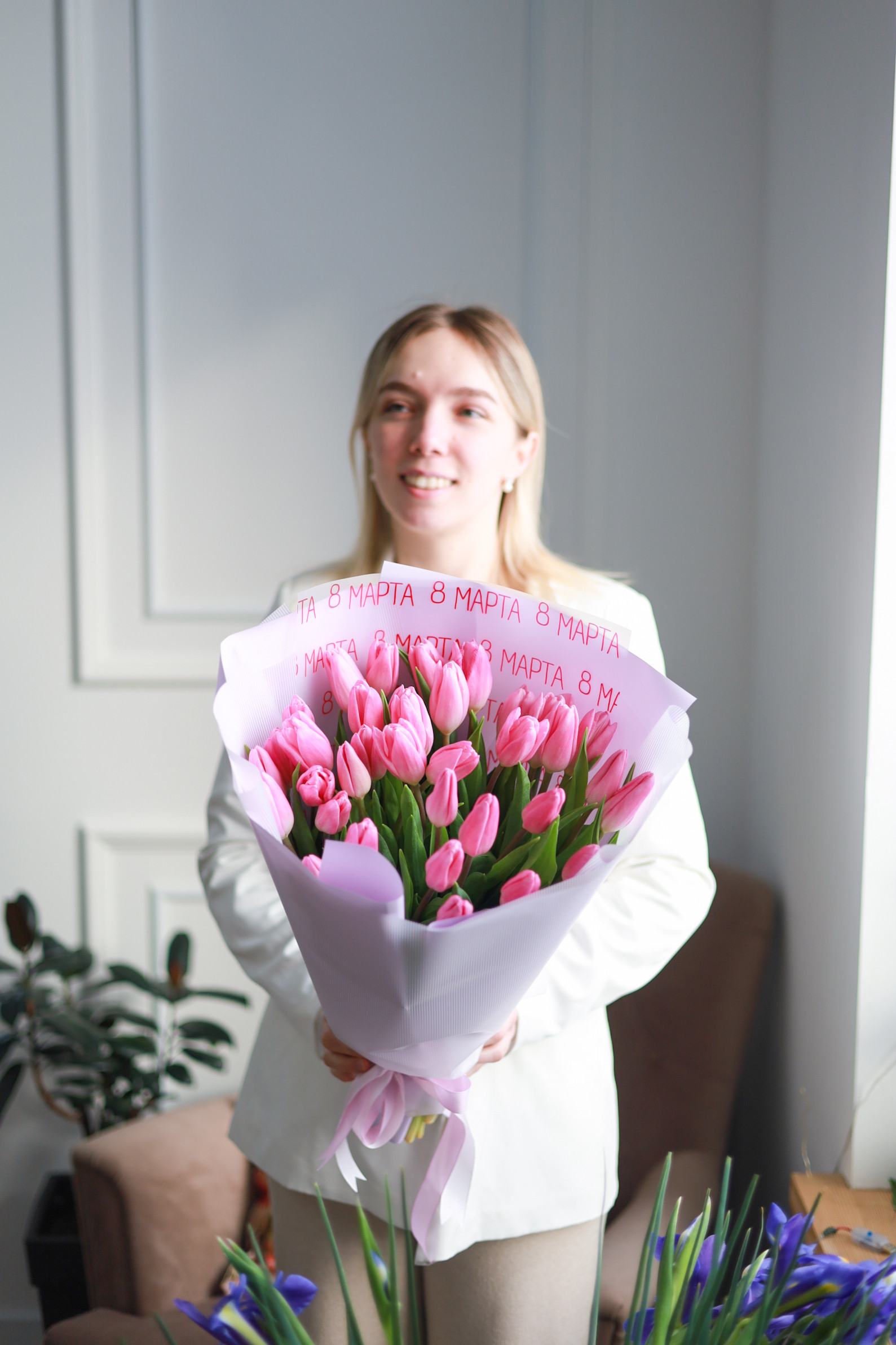 Красивый нежный букет из 35-ти тюльпанов в оформлении.