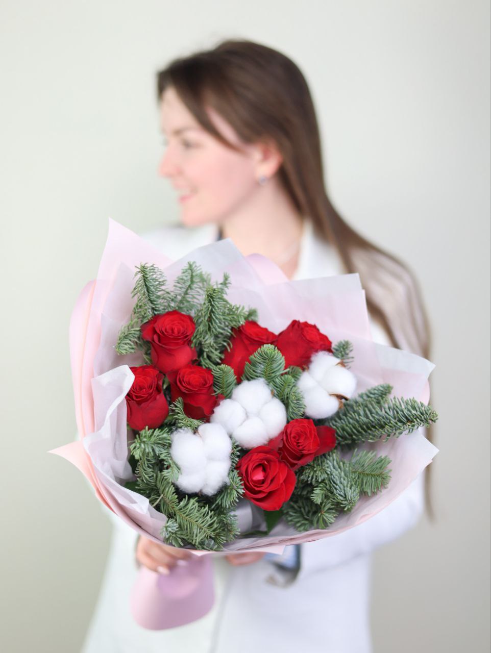 Букет стойких роз, хлопка и датской ели в оформлении.