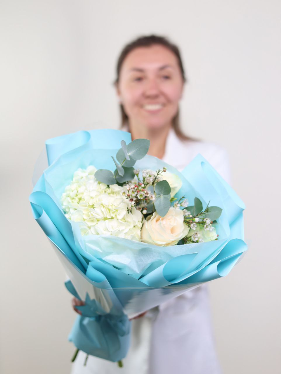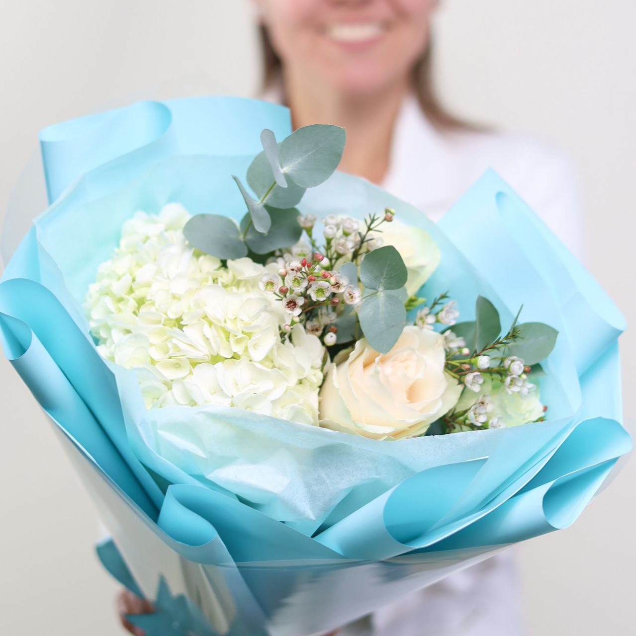 Букет в белой гамме с пышной гортензией, розой, хамелациумом и эвкалиптом в оформлении.