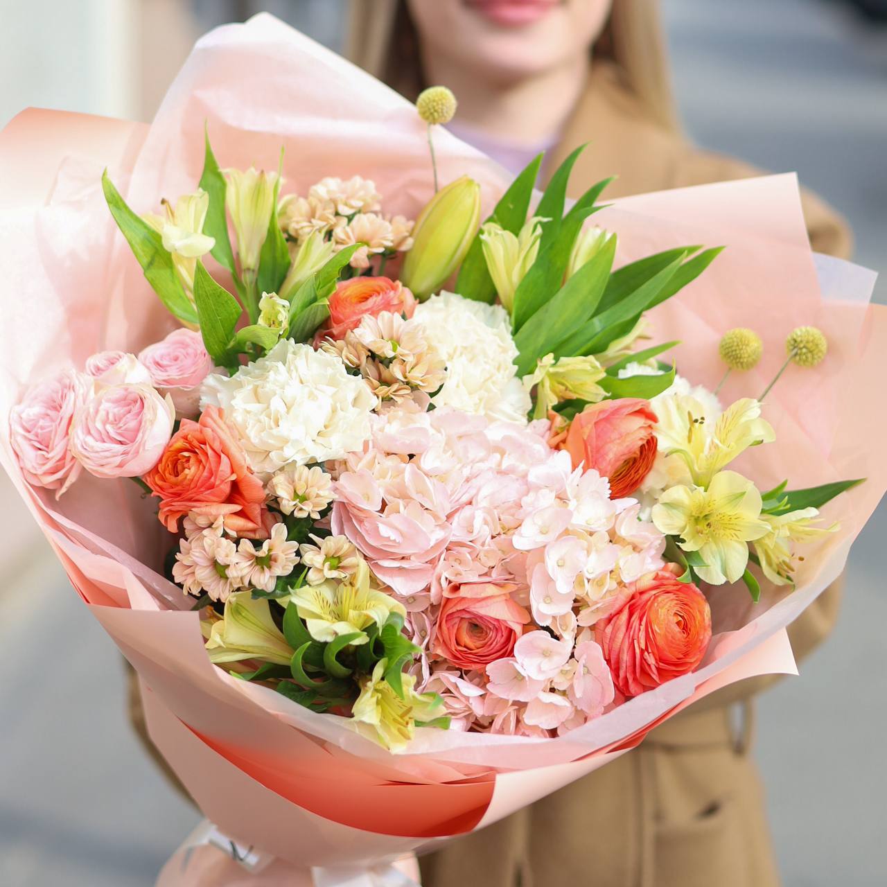 Букет пышной гортензии, ранункулусов, кустовых роз, стойкой альстромерии, хризантемы и краспедии в оформлении.