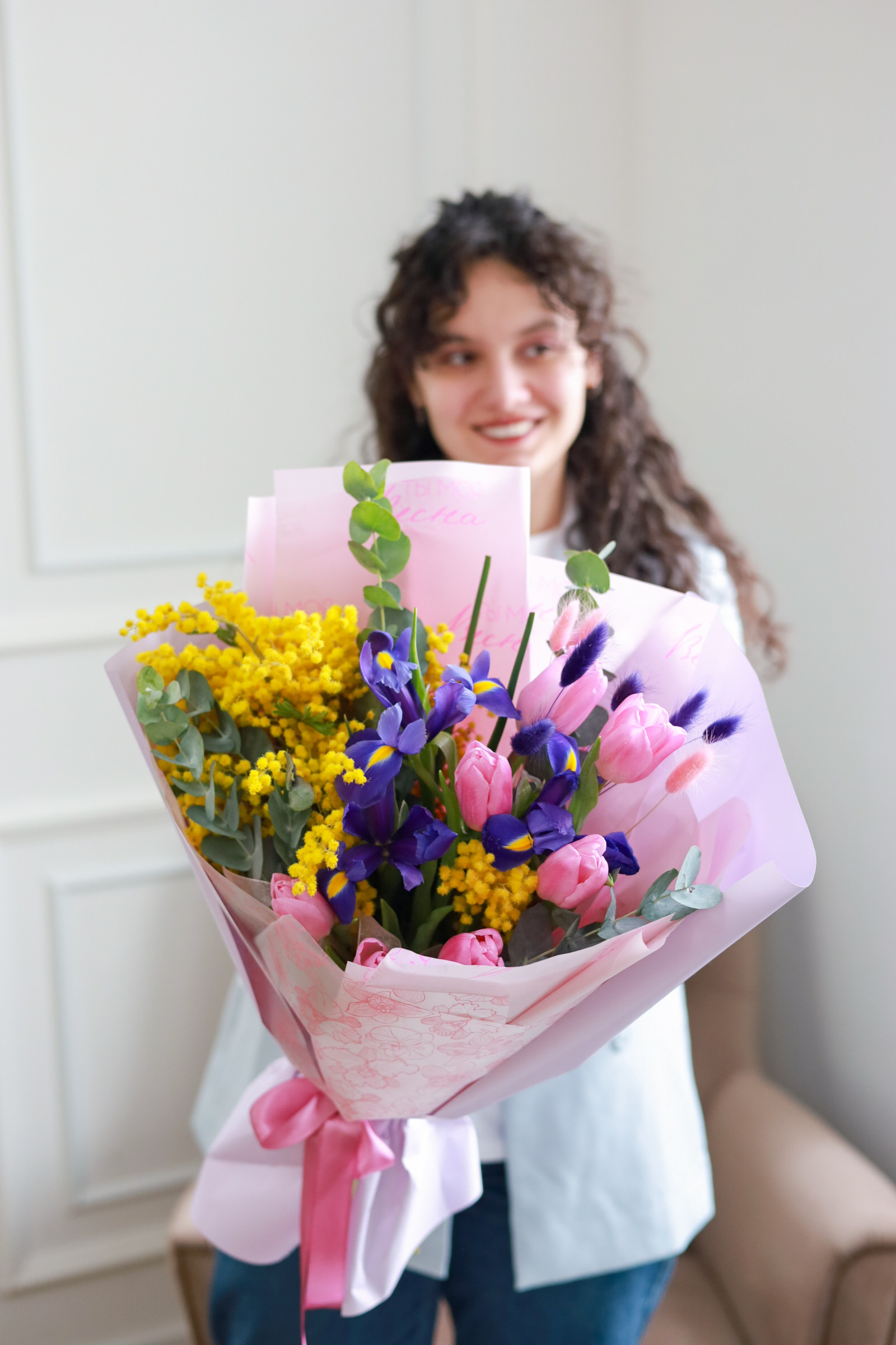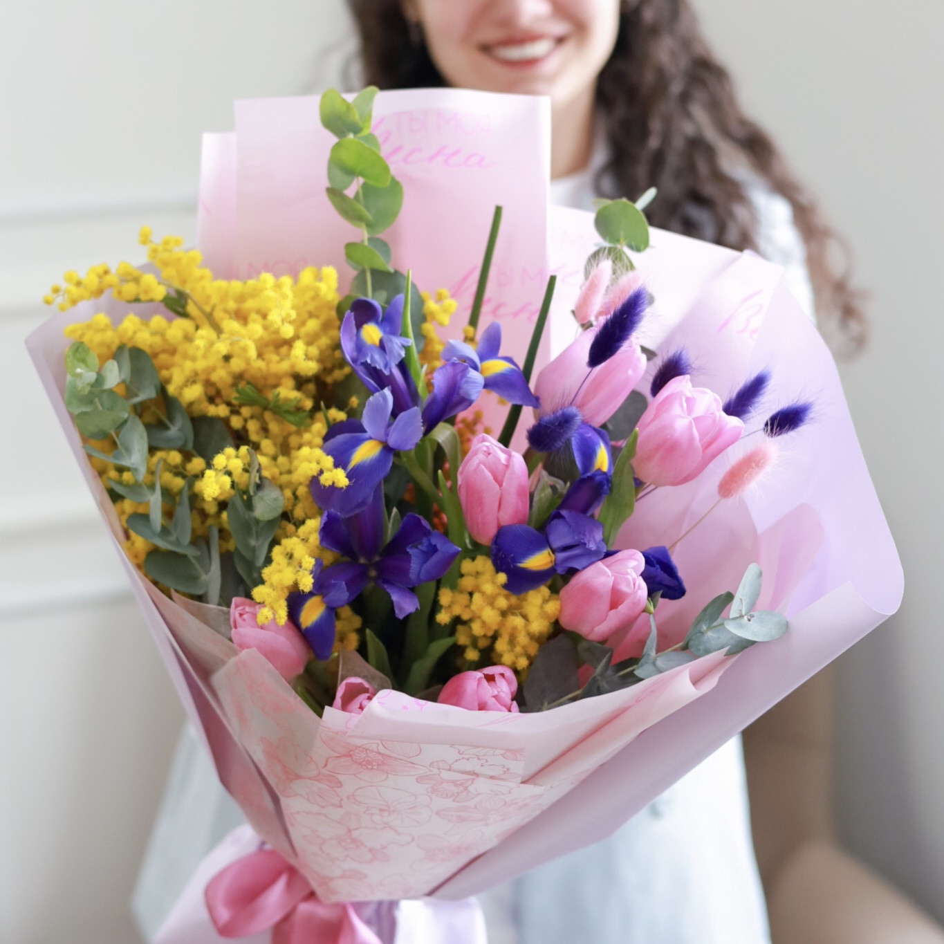 Состав: тюльпаны, ирисы, мимоза, душистый эвкалипт.