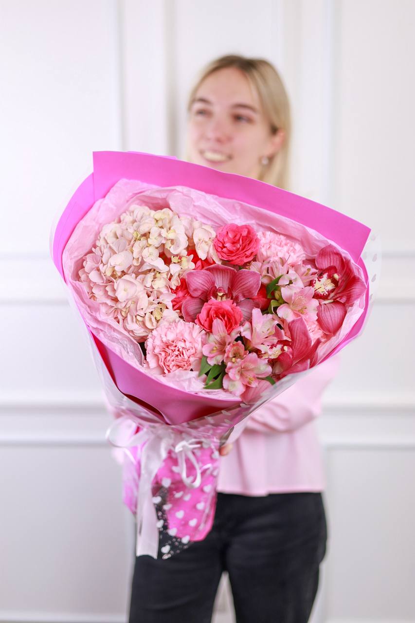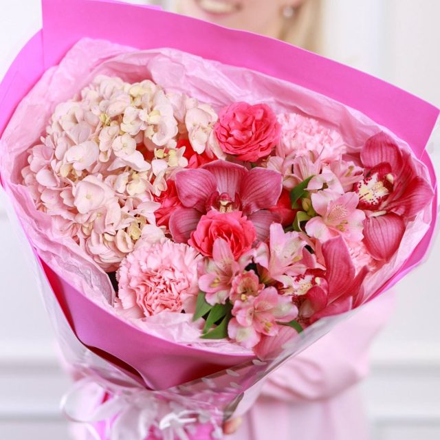 Букет пышной гортензии, орхидей, кустовых роз, стойких диантусов и альстромерии в оформлении.