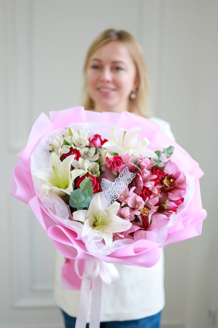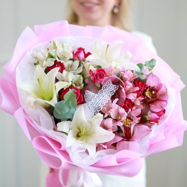 Букет ароматных лилий, стойких орхидей, альстромерий, кустовых роз и эвкалипта в оформлении.