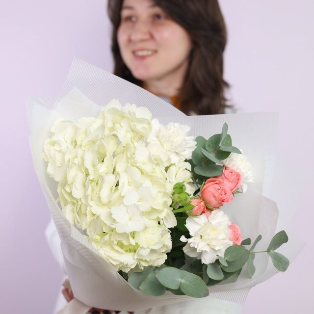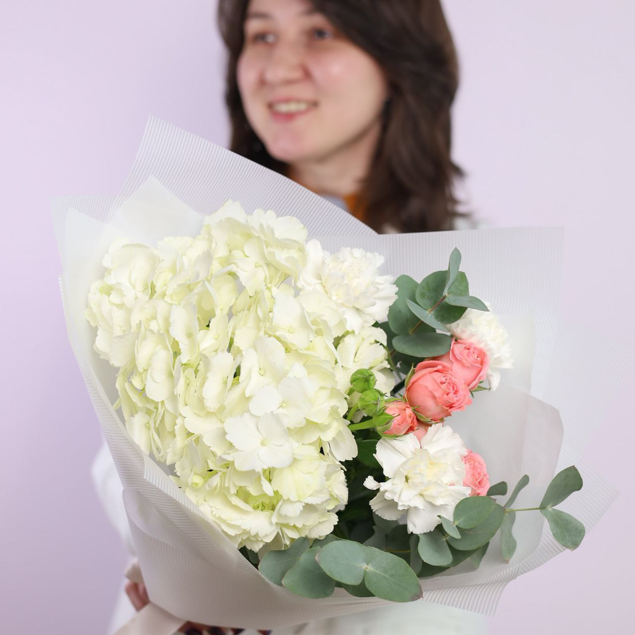 Букет пышной гортензии, кустовых пионовидных роз, стойких диантусов и душистого эвкалипта в оформлении.