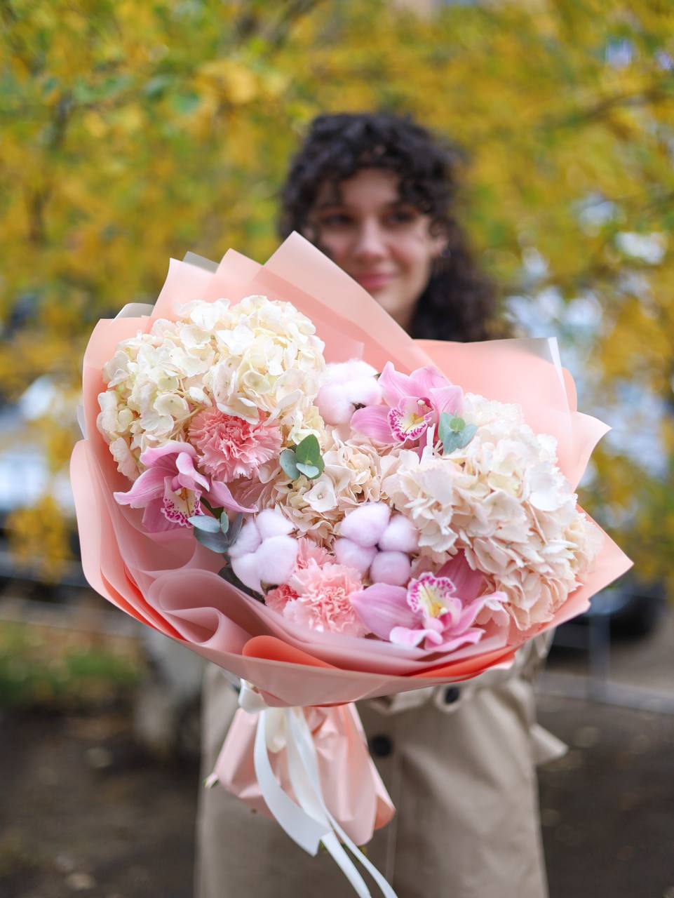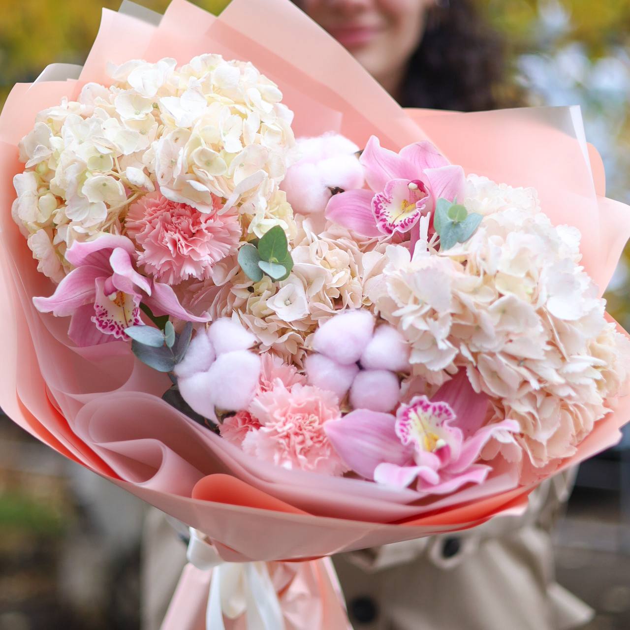 Букет пышных гортензий, орхидей, стойких диантусов и воздушного хлопка в оформлении.