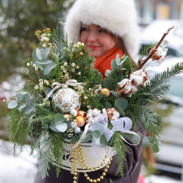 Состав: натуральная ель нобилис, туя, ёлочные игрушки, хлопок, эвкалипт, хамелациум.