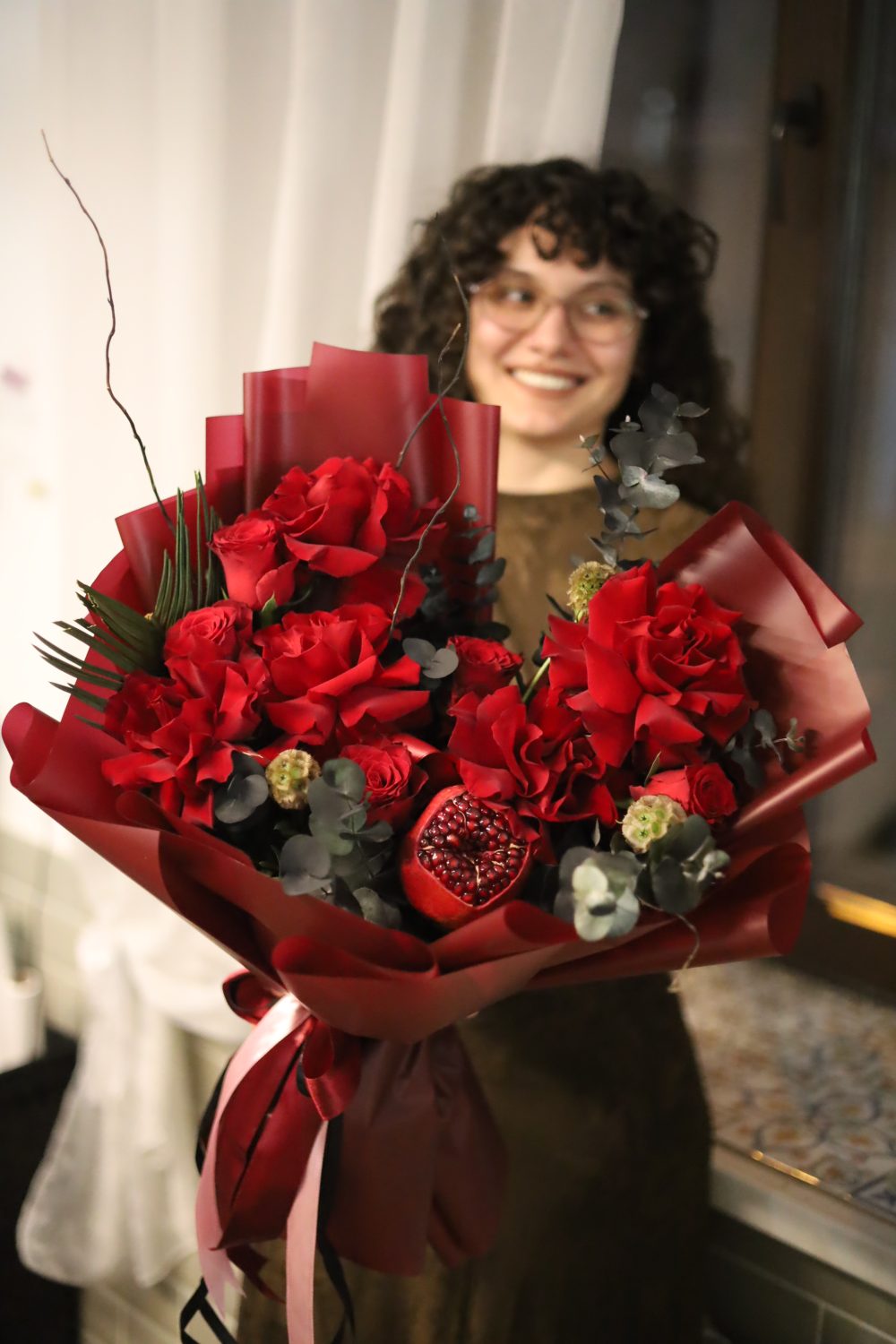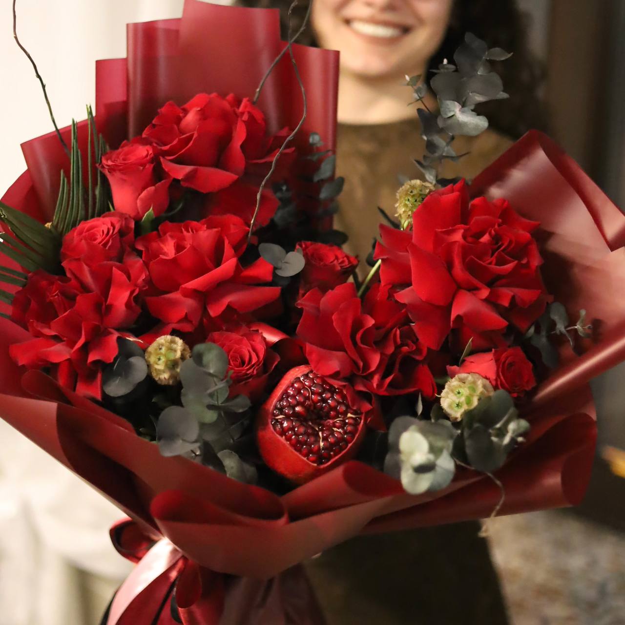 В составе:крупные французские и одноголовые розы, скабиоза, душистый эвкалипт, сочный гранат, ветки корилуса.