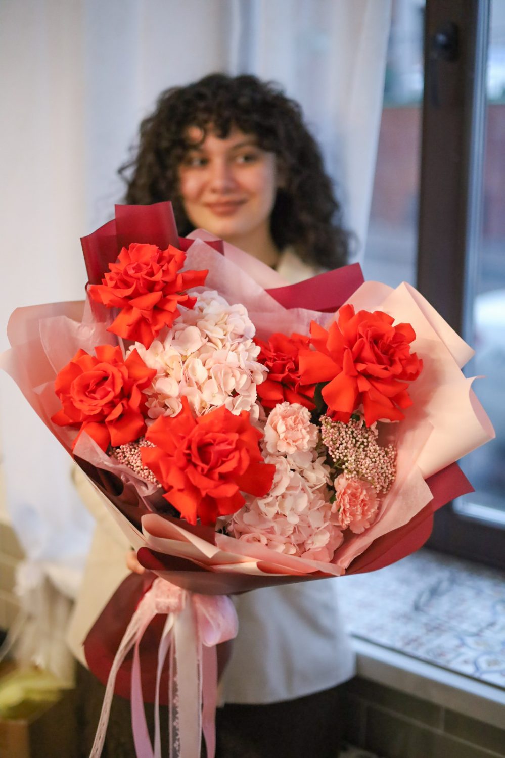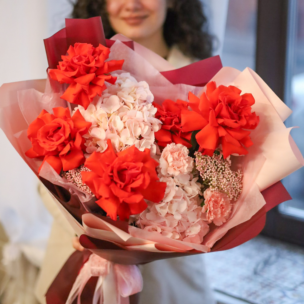 Прекрасный авторский букет в красно-розовой гамме в оформлении.