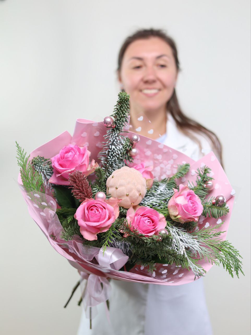 Новогодний букет роз с датской елью