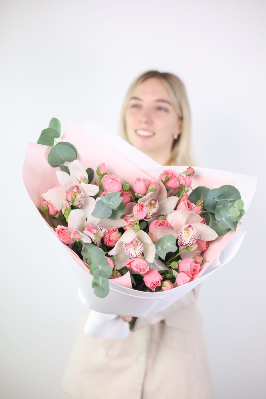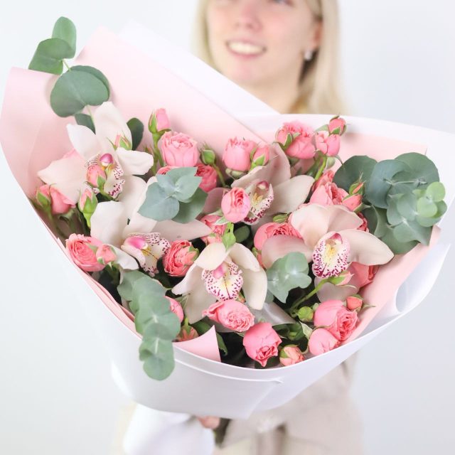 Букет с орхидеей, кустовой розой и эвкалиптом в оформлении