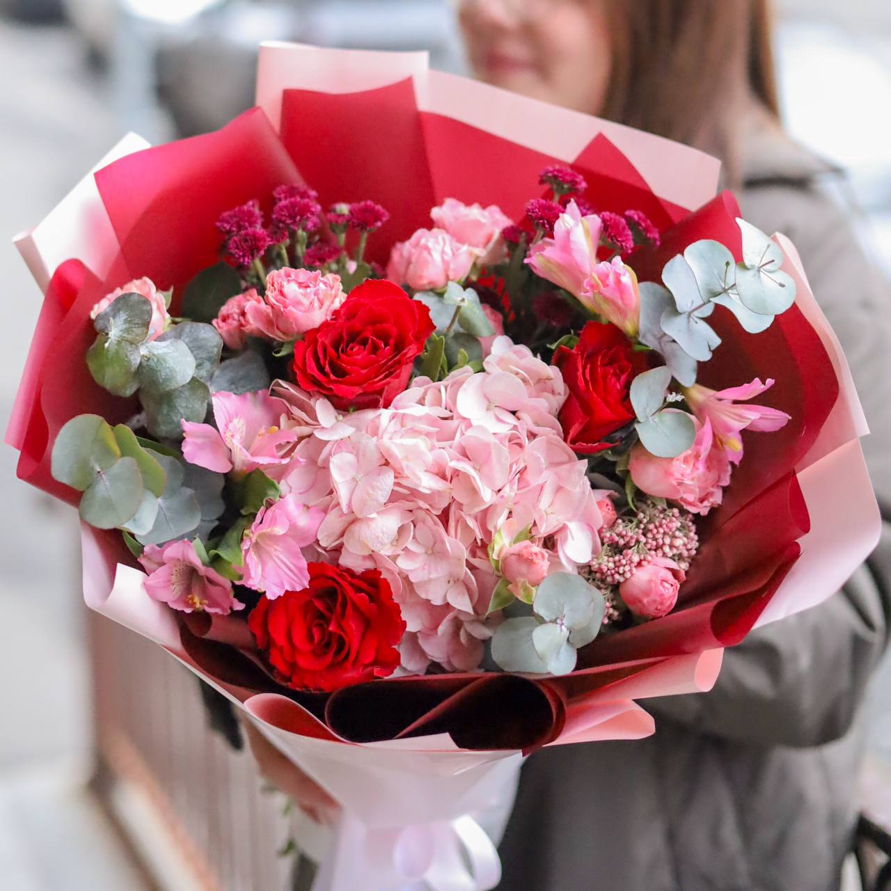 Состав: одноголовые розы, гортензия, стойкая альстромерия и хризантема, кустовые пионовидные розы, душистый эвкалипт.