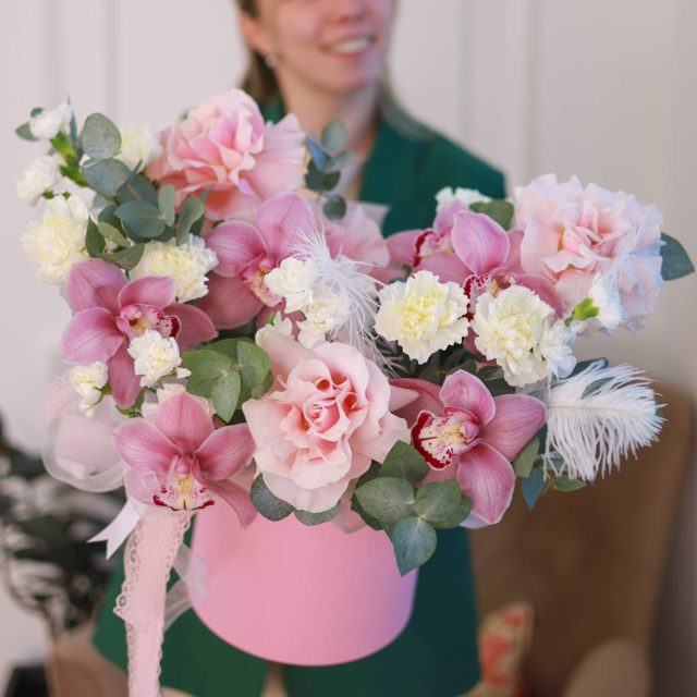 Состав: стойкие орхидеи и диантусы, французские розы, декоративные перья, душистый эвкалипт.