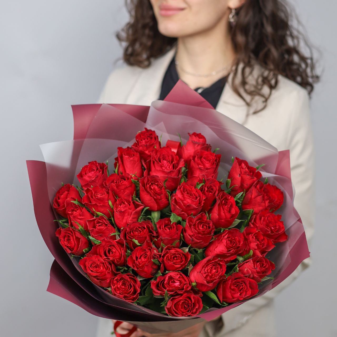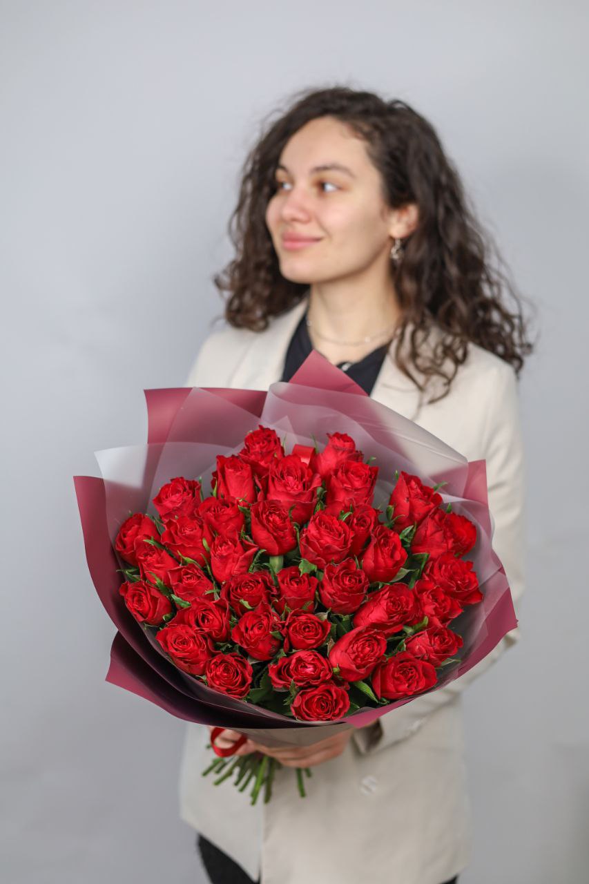 Потрясающий букет из 35-роз в оформлении. Высота букета около 45 см.