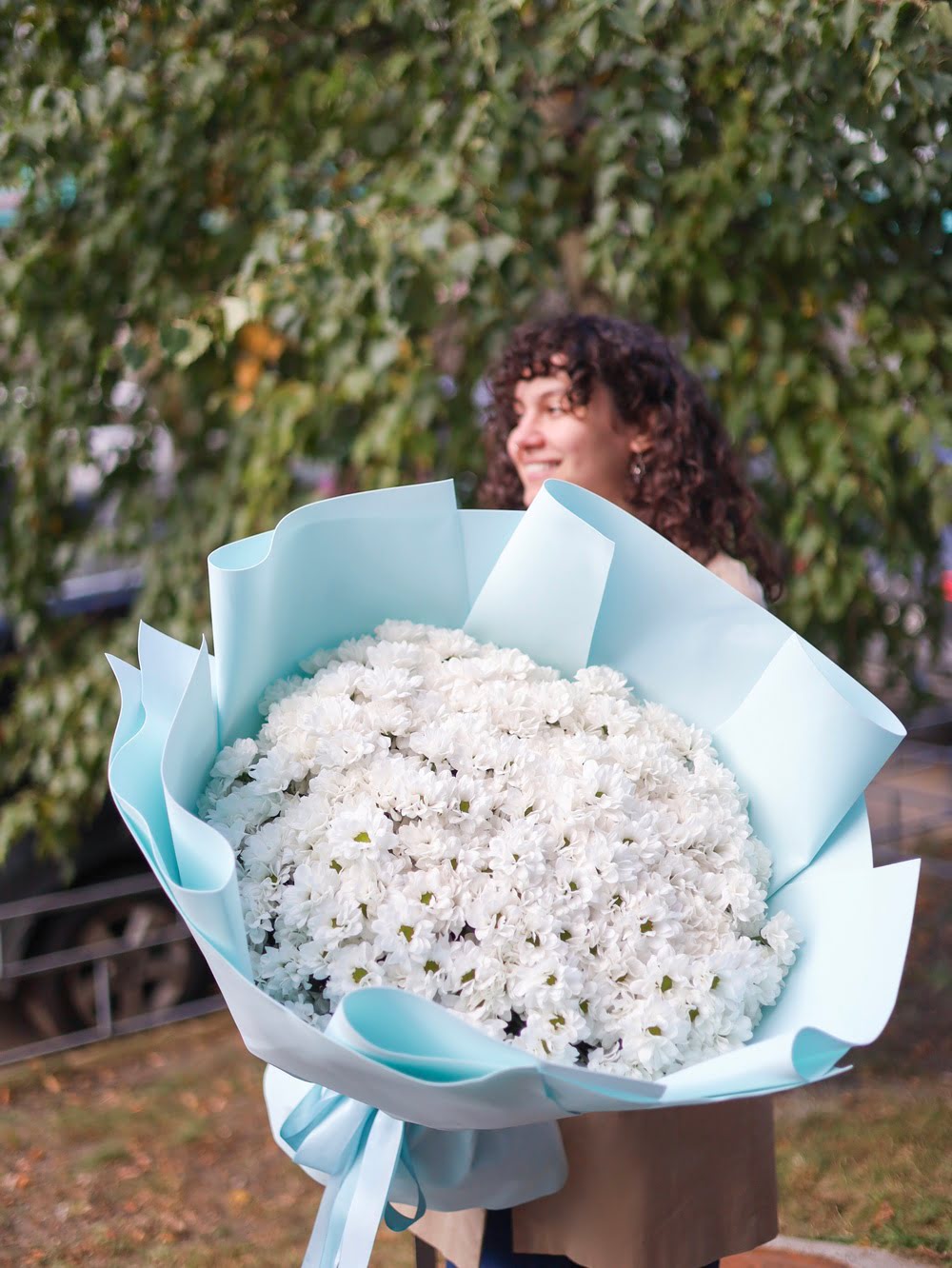 Букет из 51-ой ветки кустовой ромашковидной хризантемы в стильном оформлении. При должном уходе букет может простоять около 2-х недель.